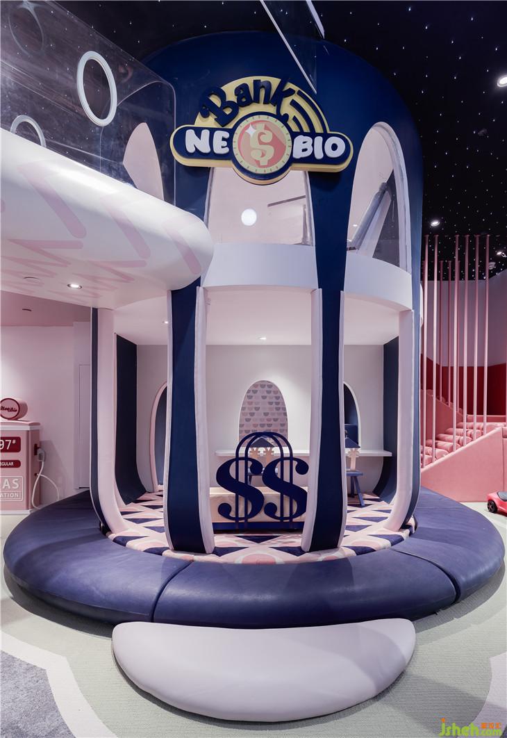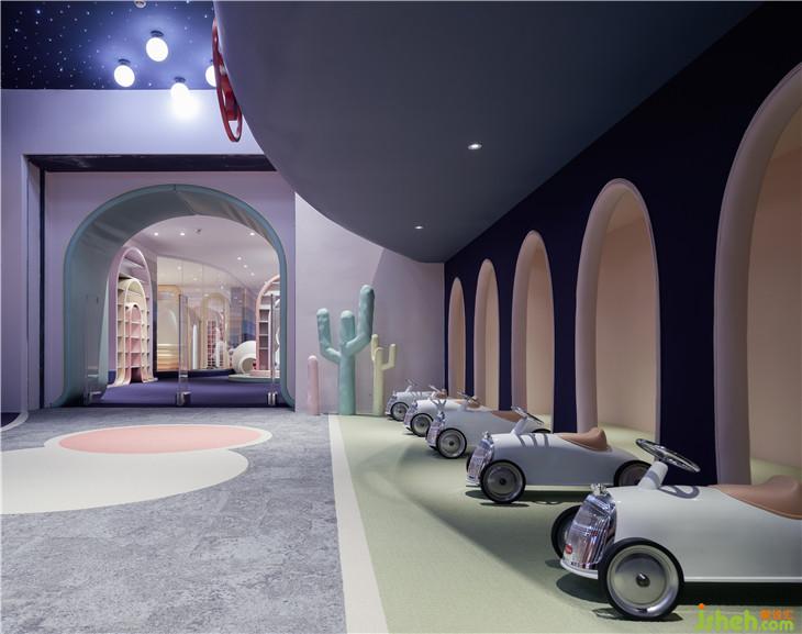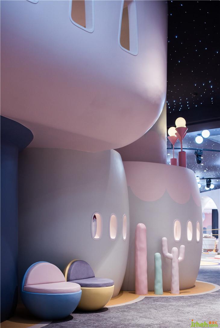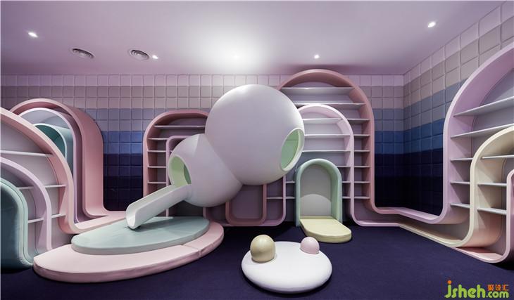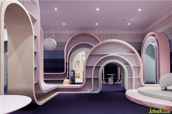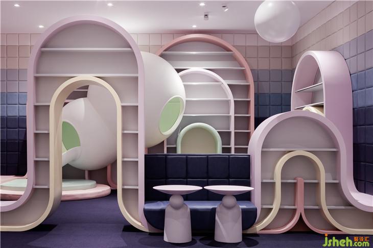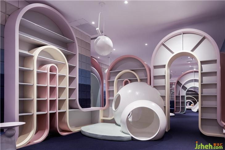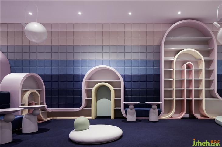 第二區(qū)域:圖書區(qū)--借用彩虹與云朵的關(guān)系表達(dá)雨過天晴后的絢麗景象,并用抽象后的構(gòu)圖完成書架功能以及孩子樂于實(shí)踐的爬高與鉆洞的娛樂功能。