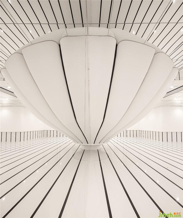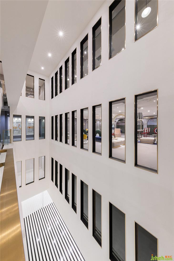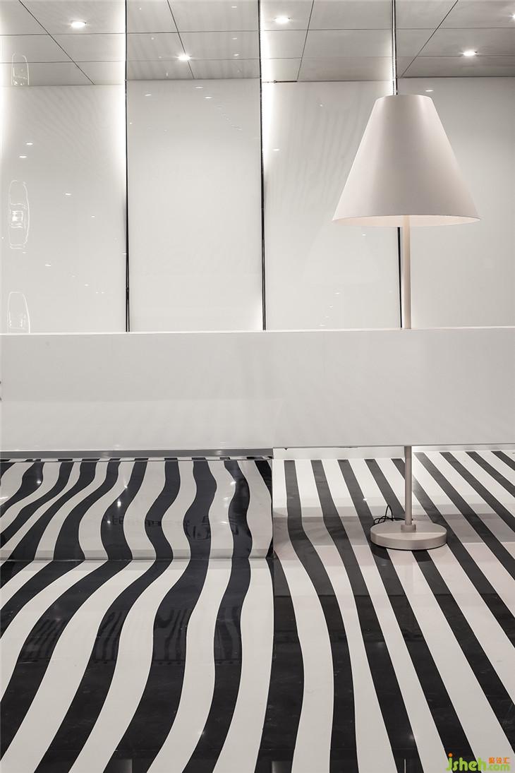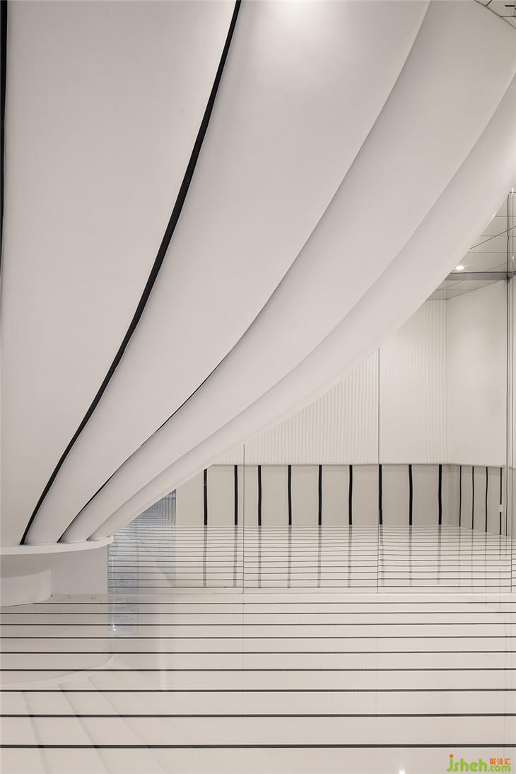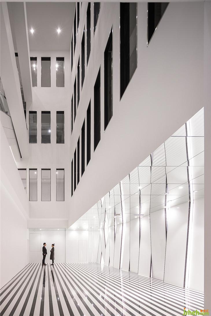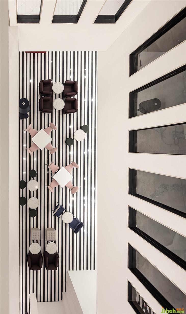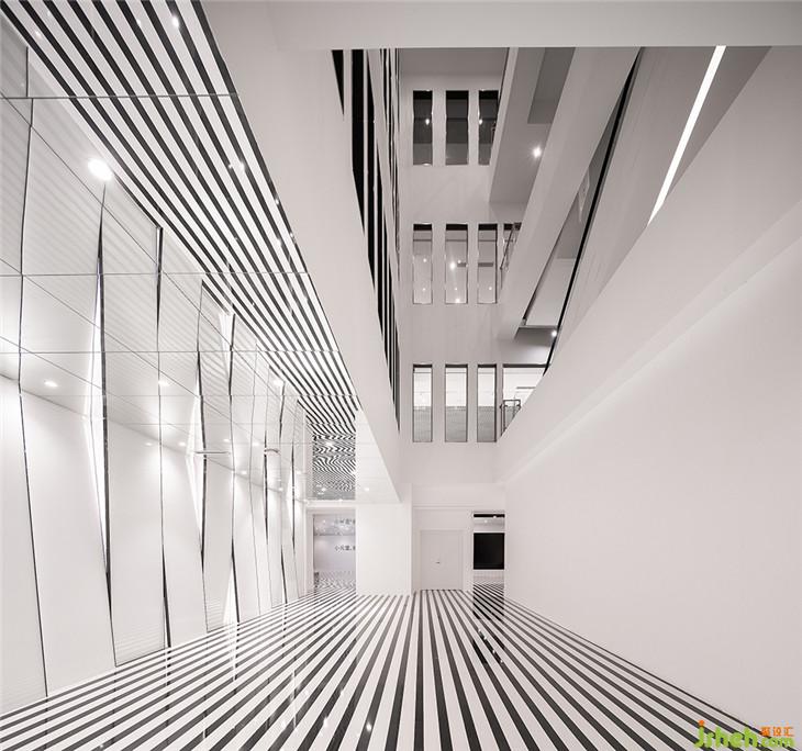 在一層我們設(shè)置了兩個入口,南側(cè)的主大堂空間,主要作為辦公層的入口,主要承擔(dān)接待問詢的功能,我們留了很大的空白來體現(xiàn)大堂的氣質(zhì)。并且在內(nèi)部我們營造了一個連通一到四層整個空間的內(nèi)中庭,把建筑的外立面窗格做在室內(nèi),讓人們在室內(nèi)感受室外的建筑感,并且在扶梯的上升過程中能感受一到四層不同的空間美感。在大堂我們引用了水流的概念,黑白條地面水波紋的起伏,流動,象征著企業(yè)的承載和不斷的前進。北側(cè)的次入口,主要是餐飲層的入口,做了一個大型的熱氣球裝置,作為視覺的焦點。整體白色的空間,為未來企業(yè)的宣傳展示和小型展覽留下無限的可能性。