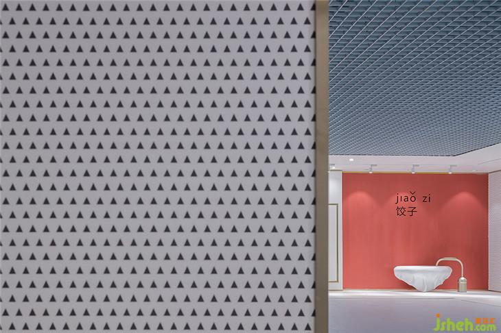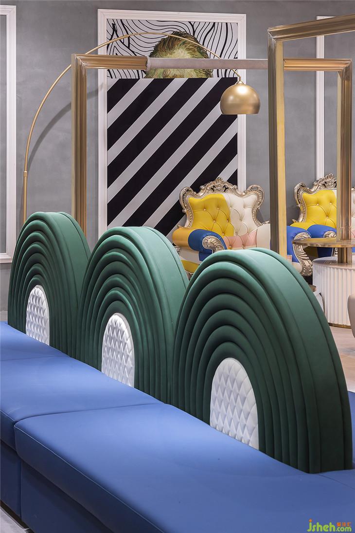 經(jīng)過扶梯上到三層辦公空間,在三層整體的布局上,我們分別在兩個(gè)扶梯上來的空間作為公共客廳區(qū)域,并且把兩個(gè)公共客廳用共享會議區(qū)、休息區(qū)串聯(lián)起來,把需要比較私密安靜的辦公空間放在客廳之外。動(dòng)靜分離的布置,一方面讓視覺點(diǎn)更集中,一方面也便于后期的運(yùn)營管理。從主大堂扶梯上來,首先看到的是work hard 的歡迎櫥窗,然后轉(zhuǎn)身會看到一個(gè)特別怪誕、藝術(shù)的公共客廳。這里我們引用了健身器械的元素進(jìn)來,想要傳達(dá)健康工作的理念。我們把單杠吊環(huán)意化成巨大的香檳金畫框,當(dāng)你穿梭其中就像置身于一幅幅畫作當(dāng)中,我們根據(jù)使用的行為模式,設(shè)計(jì)了多種座椅形式,寬敞的大沙發(fā),一個(gè)人安靜獨(dú)享的座椅,休閑的吊椅,學(xué)習(xí)的吧椅長桌。當(dāng)你在這里休憩工作時(shí),也可以在旁邊的單杠吊環(huán)拉伸一下。為了打造客廳的舒適感,我們設(shè)計(jì)了一些地毯,并且讓它和墻面的畫作結(jié)合在一起,讓它不僅是裝飾還是空間不可或缺的一部分。在客廳的邊上是一條開放式的水吧空間,還有一個(gè)休閑玩樂的海洋球池。透過水吧區(qū)可以看到兩幅怪誕的畫作,梵高自畫像的頭部和蒙娜麗莎的手分別代表男女衛(wèi)生間的標(biāo)志。穿過客廳到達(dá)共享會議室和電話亭休息間,會議室我們采用簡練的硬裝,不進(jìn)行過多裝飾,把投影機(jī)的盒子作為一個(gè)視覺亮點(diǎn)突顯出來。電話亭休息區(qū)我們采用比較溫暖的色調(diào),考慮使用的舒適性,采用軟包的坐墊和靠墊。