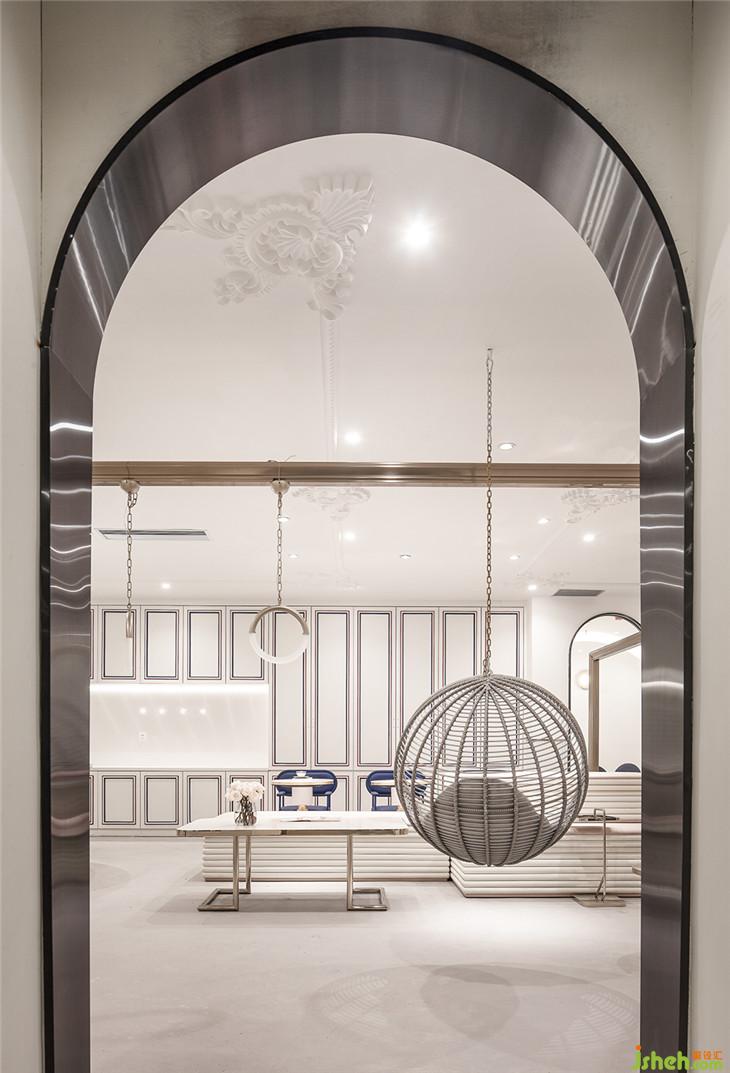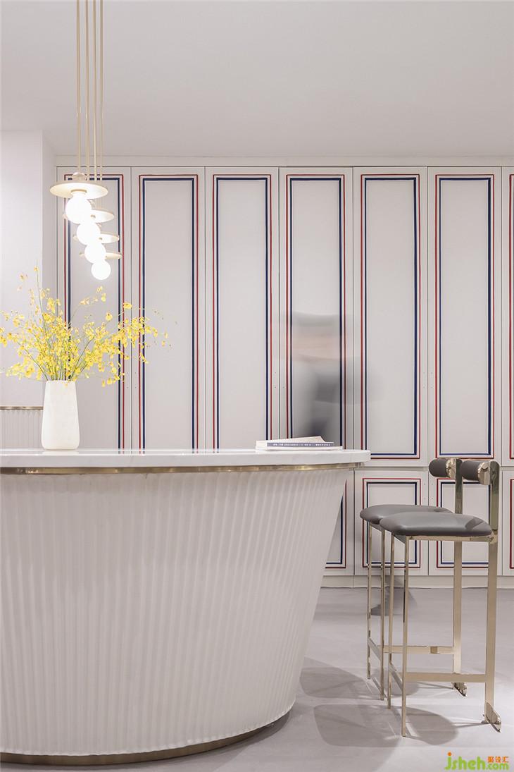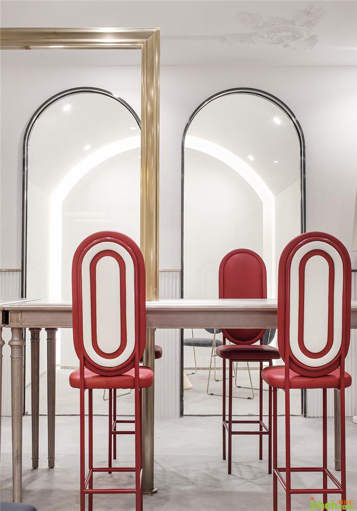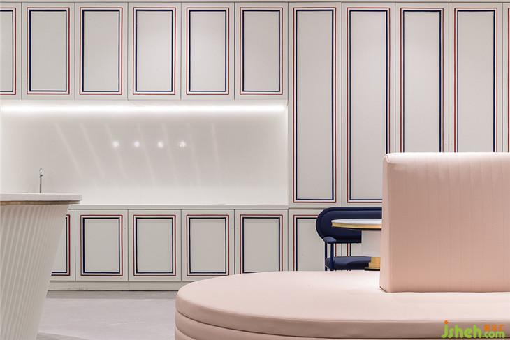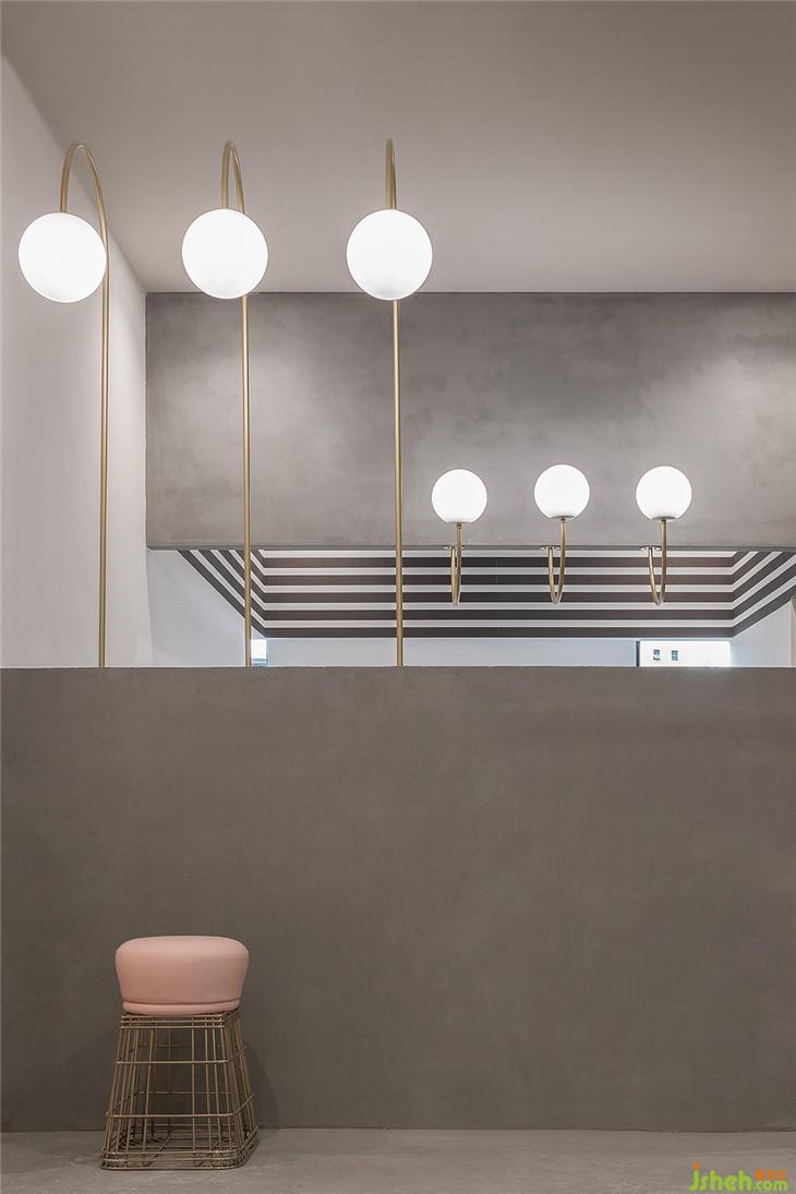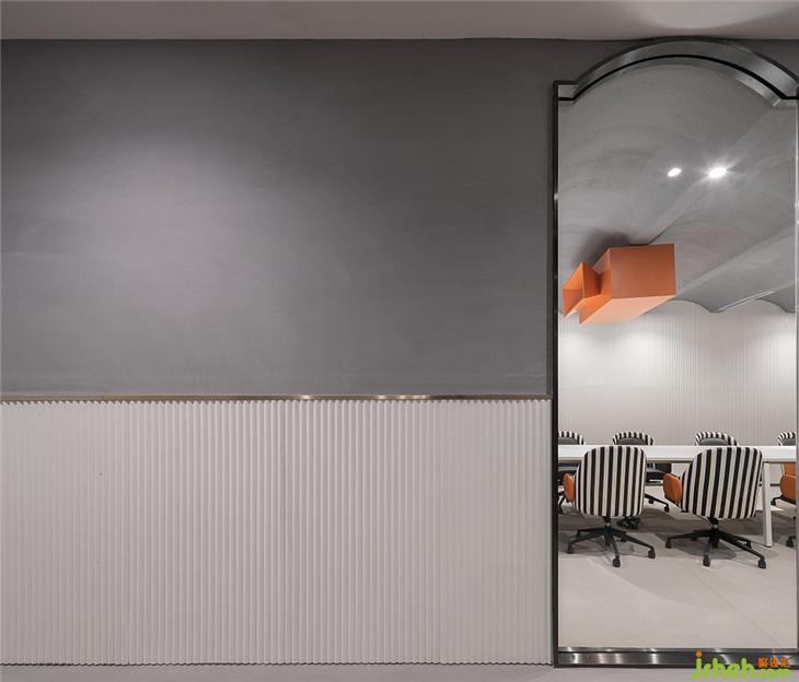 四層作為大型辦公空間,整體的布局上,同三層一樣,分別在兩個(gè)扶梯上來(lái)的空間作為公共客廳區(qū)域,大型的辦公室環(huán)繞在客廳周圍,讓每一間公司都能快速的到達(dá)??蛷d區(qū)域依然采用多種的座位形式滿足不同的需求,公共的水吧空間也融合在這里,同時(shí)設(shè)置相應(yīng)的私密休息空間。因?yàn)獒槍?duì)的客群的不同,在調(diào)性上偏成熟穩(wěn)重,在空間里運(yùn)用比較多的木飾面和灰粽色的混凝土飾面。家具也不同于三樓的怪誕色彩,更偏簡(jiǎn)練沉穩(wěn)。這里我們也引用了健身器械的概念,很多卡座和坐凳都引用了按摩椅、瑜伽球的概念,提醒人們?cè)诠ぷ髦嘁材荜P(guān)注一下自己的身體。