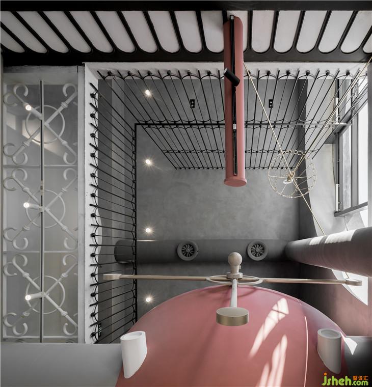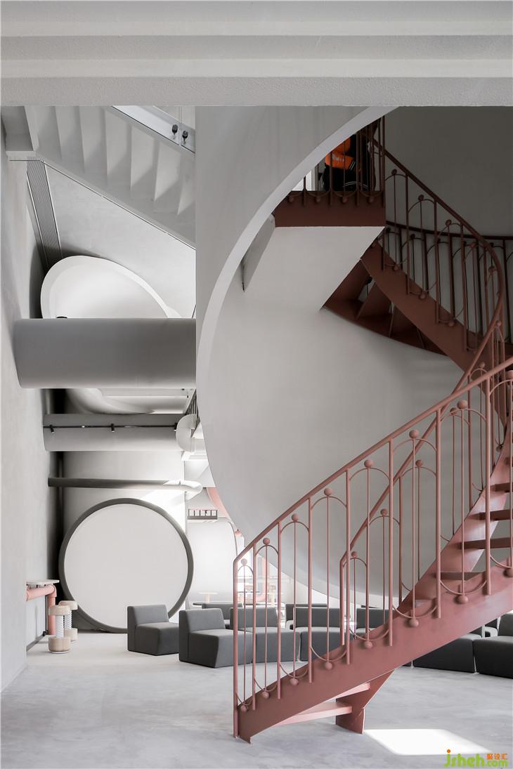 我們把原本是兩層的空間的樓板全部拆除,變成一個搞達(dá)8、9米的通高空間,在地面用極簡的手法來還原,這些“反應(yīng)罐”中會設(shè)置新零售的體驗設(shè)備。消費者可以在不同的罐當(dāng)中感知不同的設(shè)備帶來的新商業(yè)的消費體驗感。并在4-5米高的空間中重新搭建樓板,交錯穿插在我們還原的“反應(yīng)罐”當(dāng)中作為二樓共享研發(fā)人員辦公的工作與交通平臺,這樣,工作人員在空中的平臺上工作,消費者在樓下體驗空間里新科技與信息化帶來的商業(yè)體驗,通高空間的視線聯(lián)動也使得他們可以互相感知到彼此的存在,讓空間變得更加有趣。整個空間借由工廠構(gòu)圖來搭建的背景下更利用“能量傳送管”的構(gòu)圖來隱藏全部電線與空調(diào)的設(shè)備線路,使得空間暴露出來的工業(yè)化設(shè)計都被精致的修飾藝術(shù)簡化,原本應(yīng)該存在空間的工程管線被完美的隱藏在后創(chuàng)作的“能量疏通管”當(dāng)中。更在部分空間使管道聯(lián)動到地面上,結(jié)合造型創(chuàng)造了一系列的休息桌椅,使空間看起空間層次豐富但是亦被精致的規(guī)劃為不同視角的構(gòu)圖感。