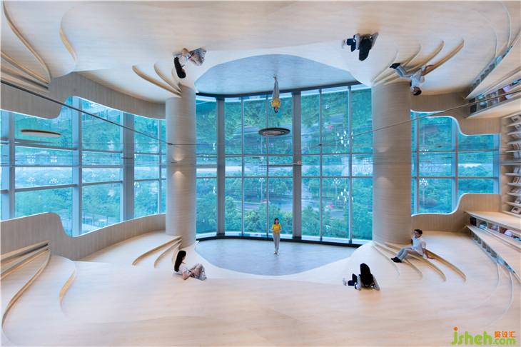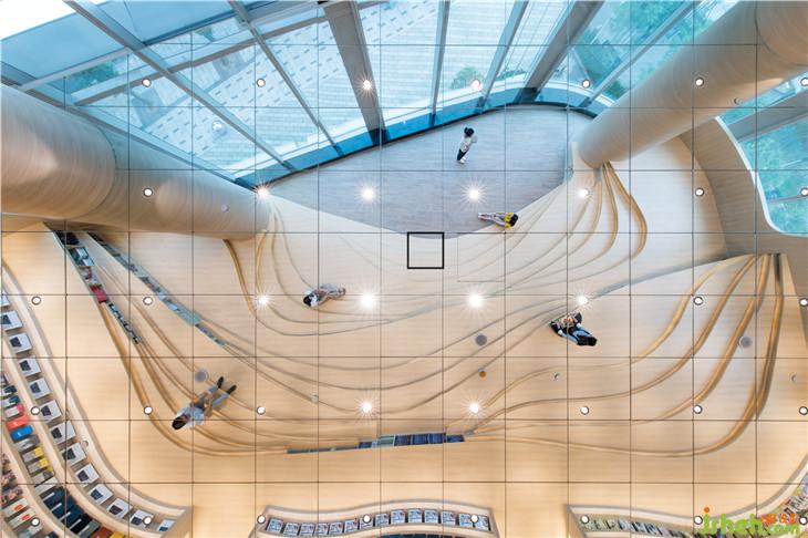 穿過“竹林”的右側(cè),便進入了兒童館,一個叢林樂園般的世界。墻面:一座座房子,風車和可愛的熊貓就仿佛隱藏竹林的背后,地面一條綿延不斷的休息棧道上跳躍著一朵朵的“大蘑菇”。為其下閱讀的小朋友撐起一把保護傘。當然鏡面天花做為鐘書閣另一個標志也不能缺席。