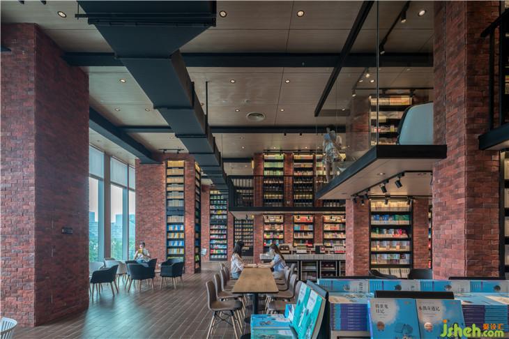 “竹林”左側(cè),隱約可見的紅色磚墻,便是此間鐘書閣最具特色的地方。通高5米的空間,紅色磚墻一砌到頂,圍合成一個個獨立的小城區(qū),空中一條步行棧道穿插著其中,時而繞墻而行,時而穿門而去。只為偶遇某一本心儀的書籍,盡情的徜徉在小小的城區(qū)中。全落地窗旁散落著可供休息的座椅,在午后溫暖的陽光下,品上一杯茶,讀著心儀的書籍,此生愜意溢于言表。
