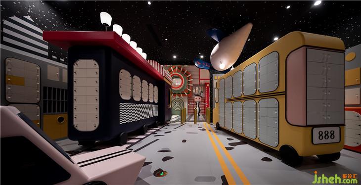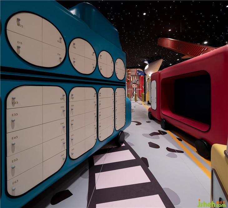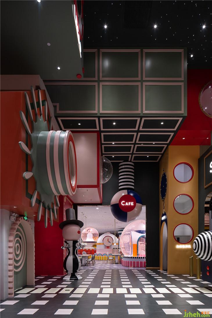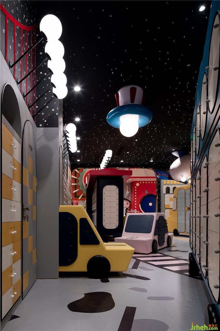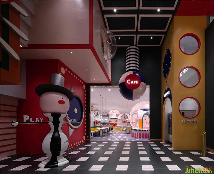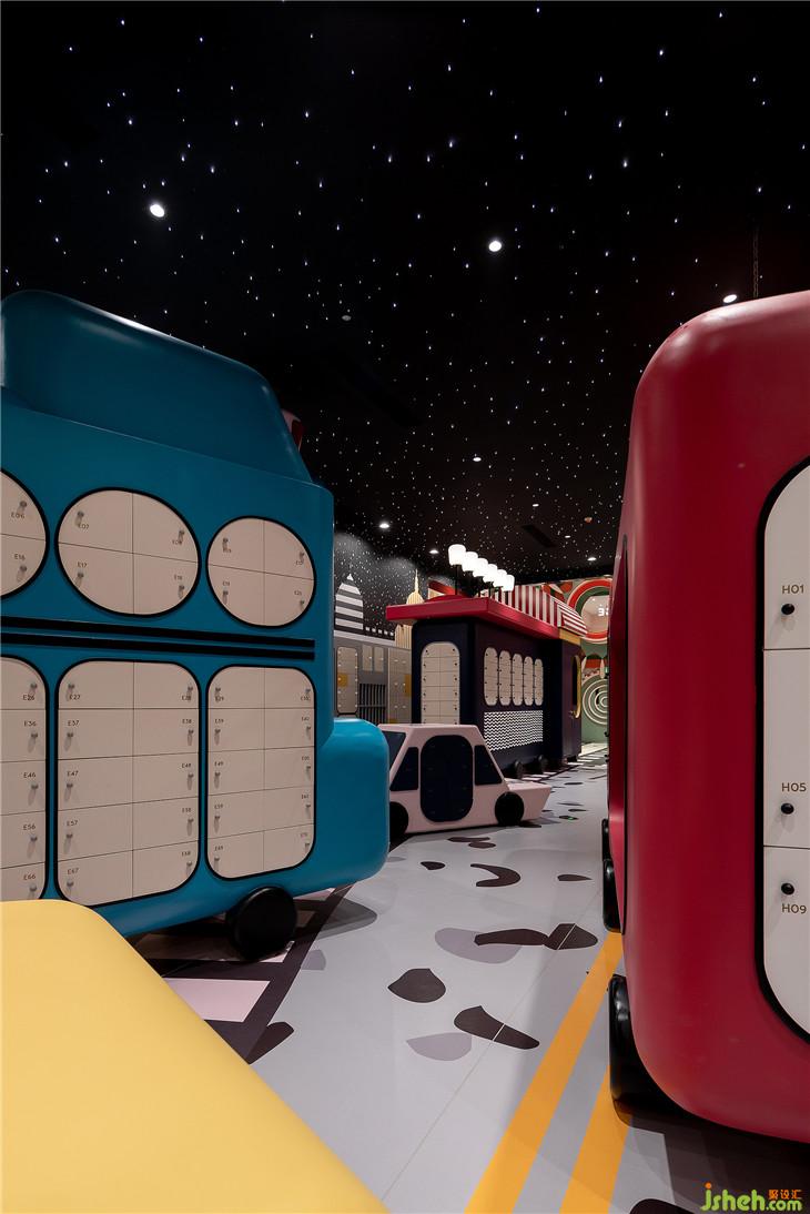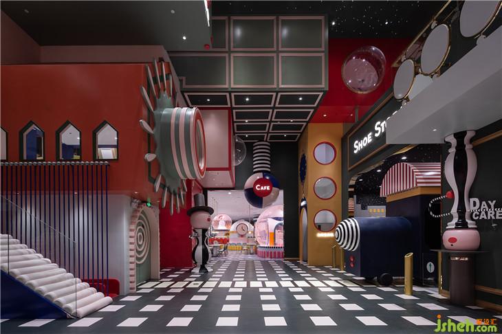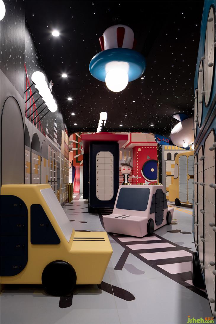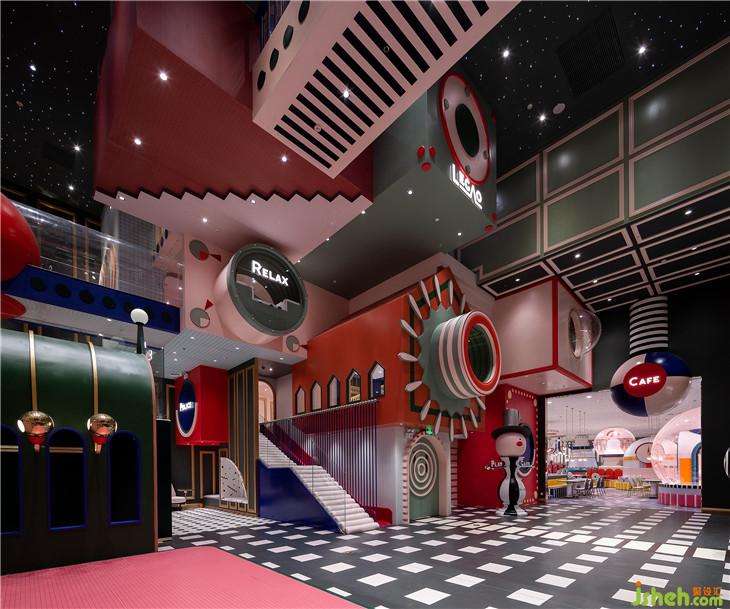 MELAND城市作為整個項目的交通樞紐區(qū),是人群的分流處,亦是動線的交匯點(diǎn)。進(jìn)入城市,模擬布達(dá)拉宮退階型設(shè)計的房屋,增加了整個空間的流線感。整個城市采用了濃郁而富有戲劇性的舞臺色彩,勾勒出格林童話般的神秘感和怪誕感。設(shè)計師引借游戲npc的概念,別出心裁地設(shè)計了一些卡通人偶裝置,卡在人群動線的各個節(jié)點(diǎn),它們既承載了指示標(biāo)牌、垃圾桶等功能,又為空間的故事情節(jié)補(bǔ)充了生動的角色。遍布在各個角落的時鐘元素,從天而降的巨大建筑塊,時間的流淌和發(fā)展的痕跡以具象化的設(shè)計手法表現(xiàn)了出來,意在提醒家長們珍惜與孩子相處的時光。