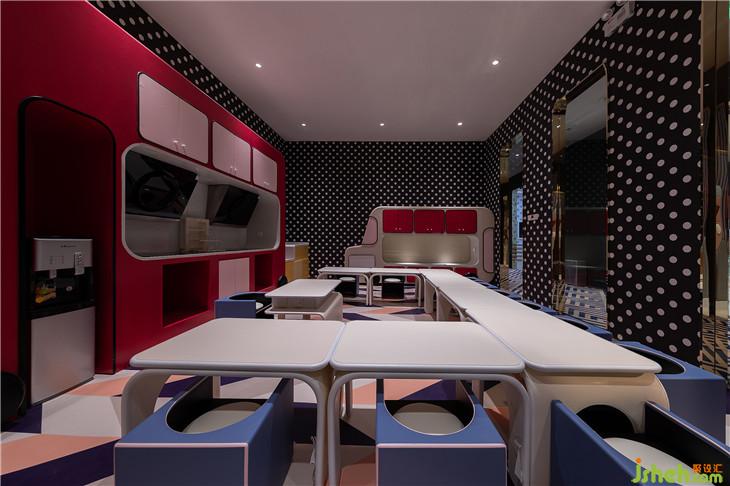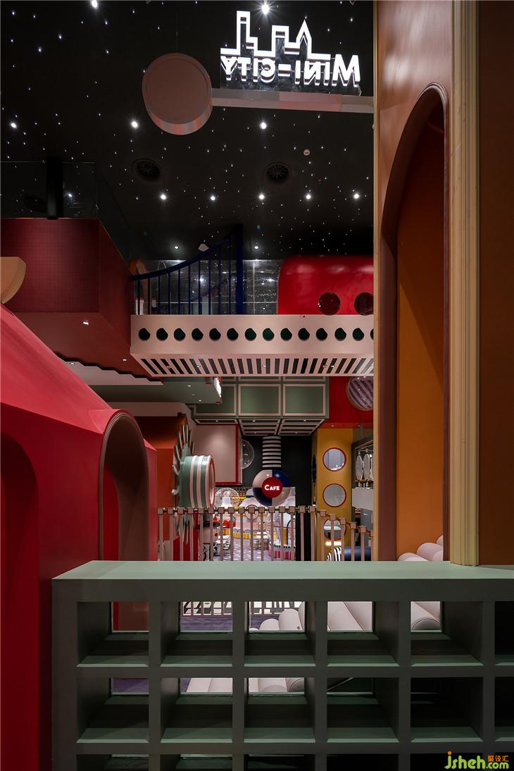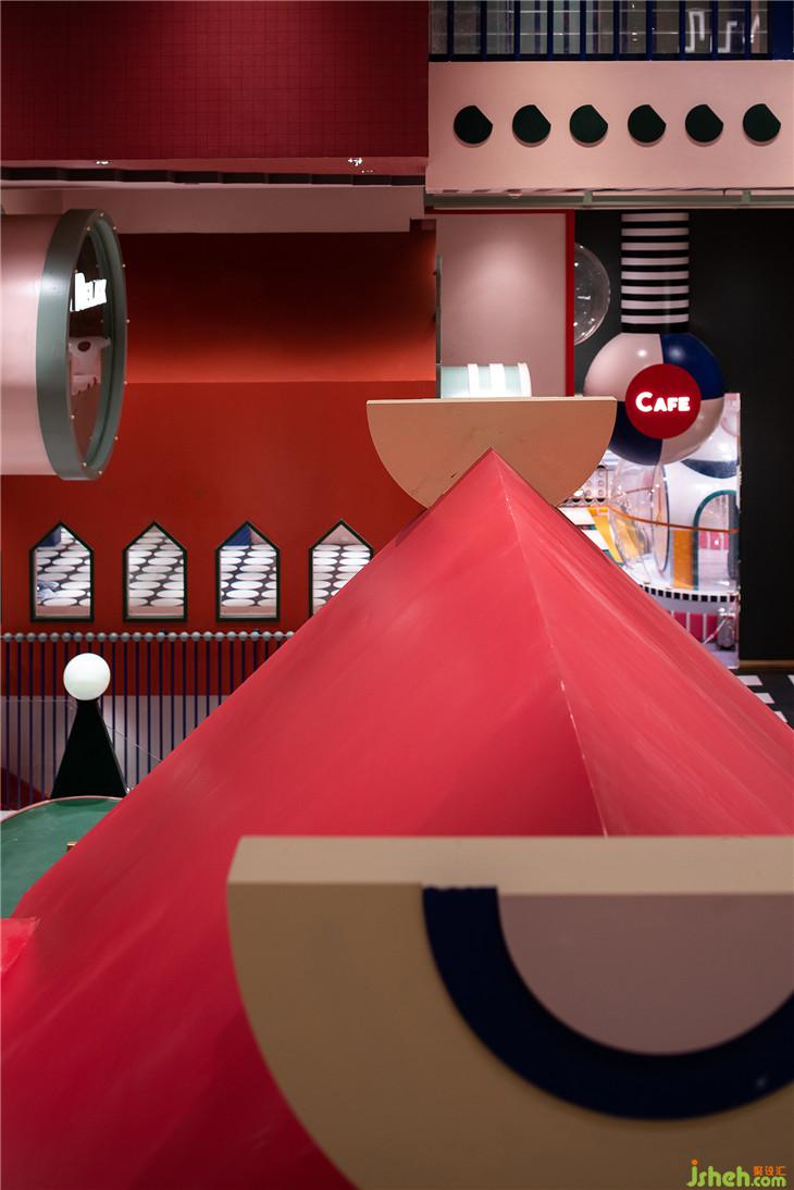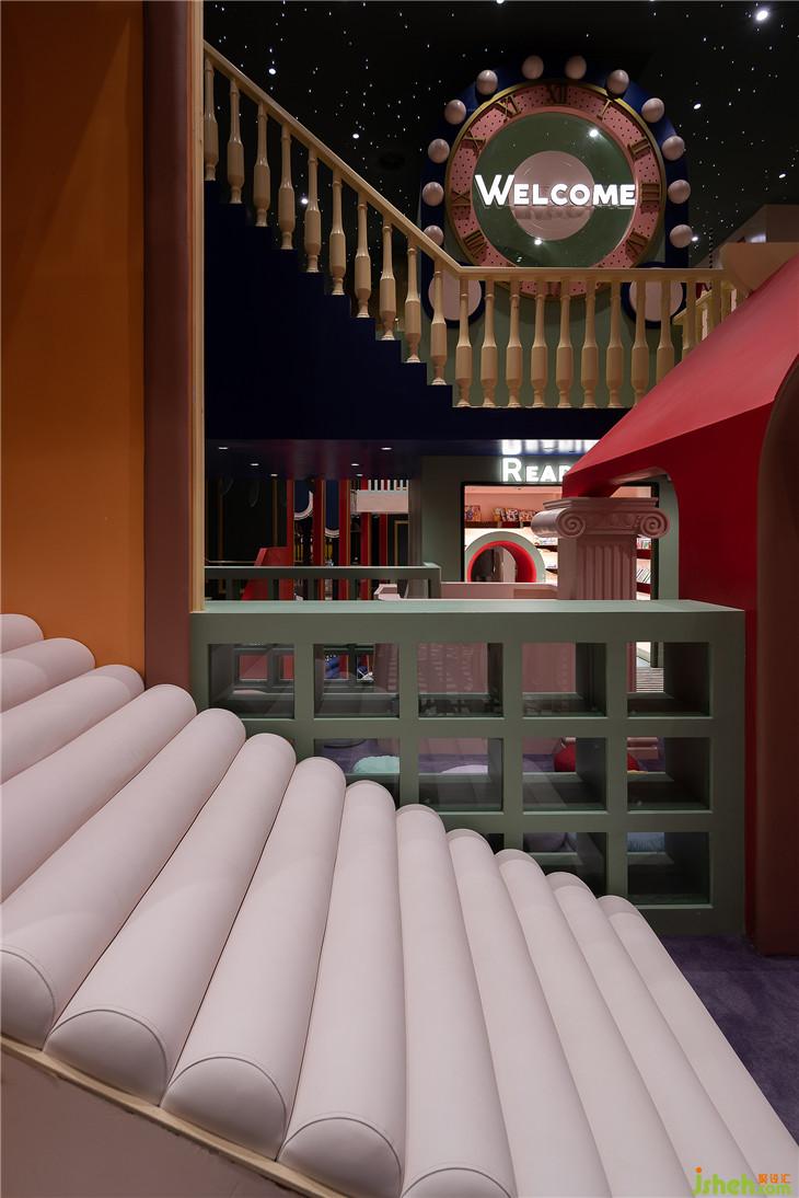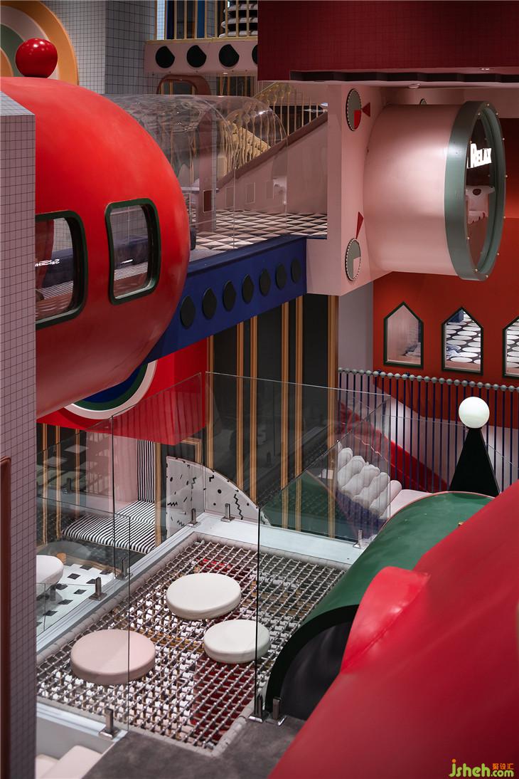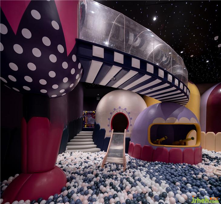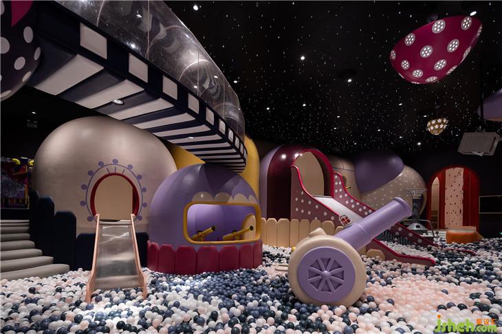球池區(qū)位于平面空間上的西南角,像是MELAND城市邊緣一塊未經(jīng)開(kāi)發(fā)的密林。由青蛙和蝸牛藝化而成的大型裝置,包裹住娛樂(lè)設(shè)施的同時(shí)也串聯(lián)起了爬道和滑梯。奇幻紫調(diào)與夸張波點(diǎn)的活潑搭配,刺激著小朋友解放愛(ài)玩鬧的天性。與傳統(tǒng)的室內(nèi)攀爬不同,在MELAND的攀爬區(qū),白色的背景墻配以紅色的支點(diǎn),與延伸到地面的紅色波點(diǎn),共同堆砌出了這個(gè)空間時(shí)尚而怪誕的藝術(shù)質(zhì)感。