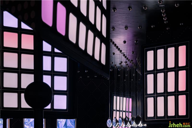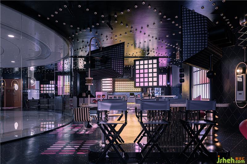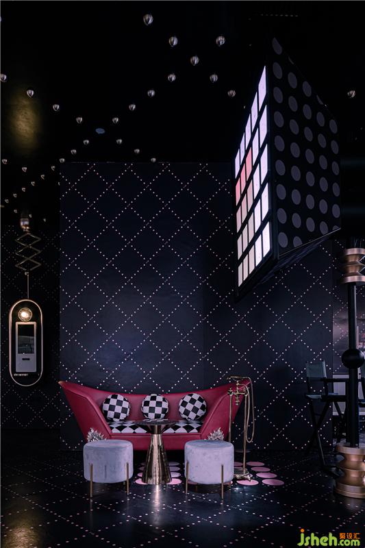 攝影燈上不同幾何形態(tài)的暖色調(diào)燈光不僅帶給觀眾極強(qiáng)的暗示,更是設(shè)計(jì)師的巧妙構(gòu)思:燈光經(jīng)過反射作用后與地面漸變交錯(cuò),在延伸的網(wǎng)格立面中明暗過渡形成流暢動(dòng)線,整體的抽象藝術(shù)風(fēng)格凝練出了創(chuàng)意與活力交匯的精湛美感。電影院設(shè)計(jì)