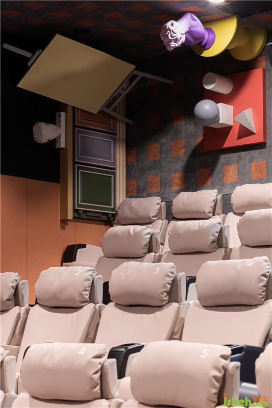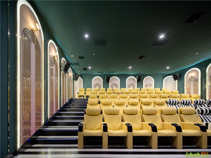 不論主題影廳或是私人包廂,設(shè)計師并未忽視聲學環(huán)境的特定要求。場內(nèi)壁布和墻面吊頂均使用了吸音裝置,個性化地毯有效減少噪音。舒適座椅結(jié)合視線高值差與視點高度,保證高質(zhì)量的聽覺與視覺享受,提升觀眾的沉浸式觀影體驗。電影院設(shè)計