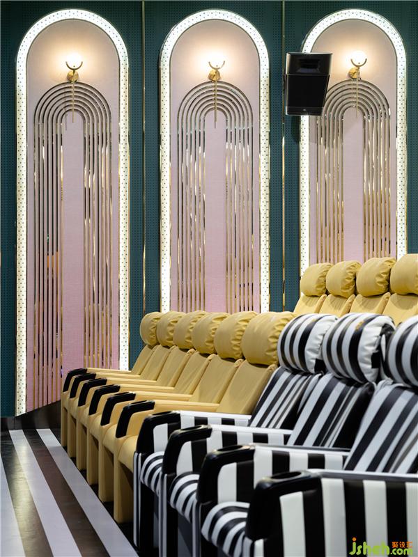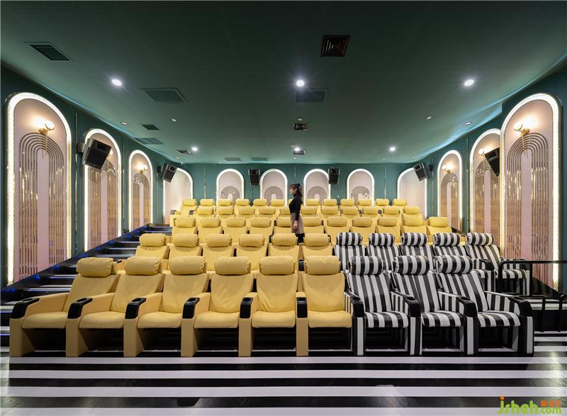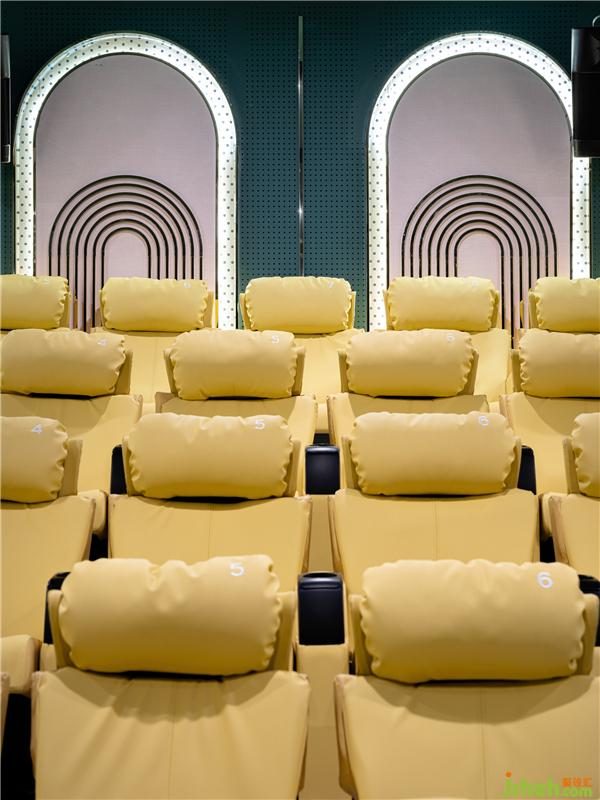 輕奢優(yōu)雅的三號影廳采用了古典建筑元素拱門,帶來規(guī)整的秩序感,黑白條地毯和座椅點綴寧靜的深綠空間,流動的視覺感受低調(diào)地烘托著影像故事。