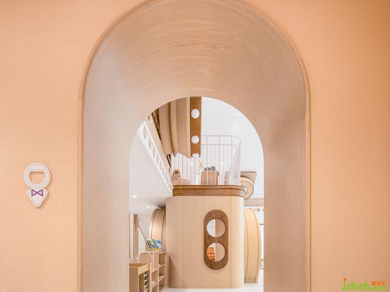 尖頂?shù)慕ㄖ庑螏砹颂厣拈w樓生活教室,幼兒園設(shè)計懷著“留下孩子們生命中的每一刻”的美好祝愿,引入了照相機(jī)這一設(shè)計元素。借用閣樓的挑高,設(shè)計師設(shè)計了可供上下攀爬的游樂區(qū),滿足小朋友玩鬧的天性,而相機(jī)的鏡頭成了孩子們的通道與爬道。墻面童趣化的裝飾呼應(yīng)了家具的淺柔的木色,也勾勒出了精致的貴族感,讓整體空間簡約而溫馨。