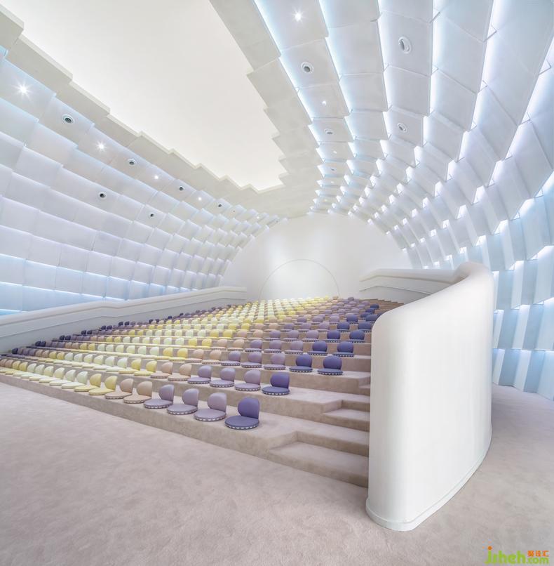 童話的質(zhì)感與色彩在禮堂內(nèi)愈加濃郁,球形的吊頂與白色的背景烘托了禮堂莊重圣潔的質(zhì)感,點亮場內(nèi)的背景燈,漸變色的座椅與燈光暈染出動人的霞光,讓整個空間顯得靈動柔美。孩子們仿佛在綻放的花蕊中,像一只只靈巧漂亮的小蝴蝶。