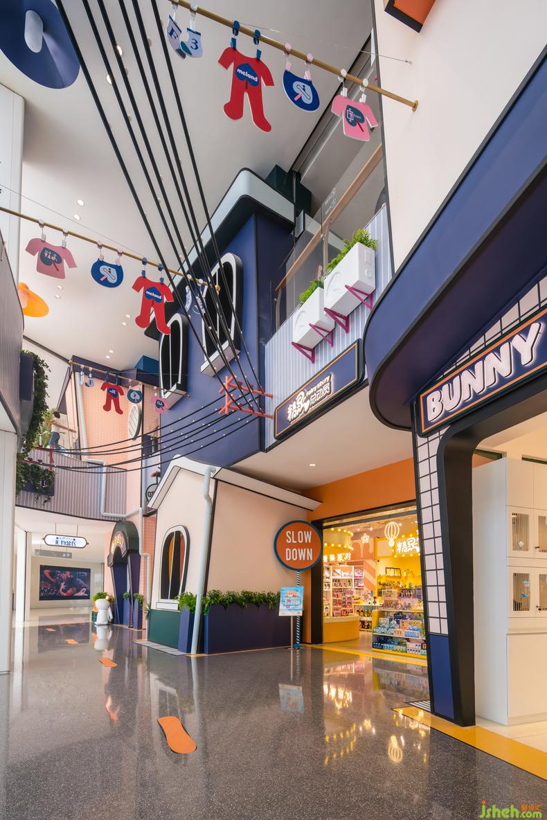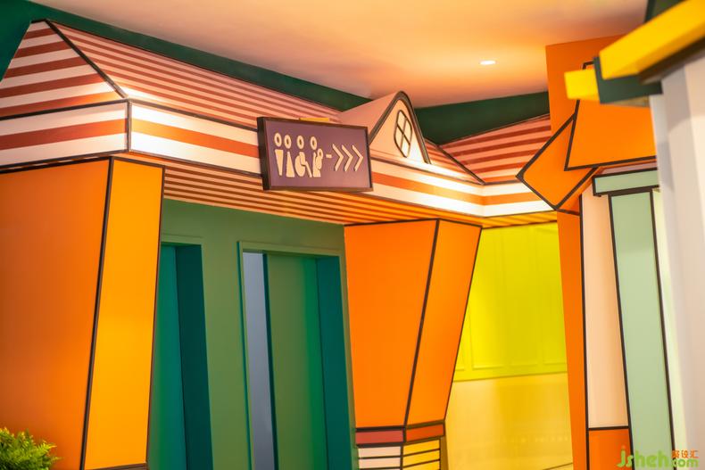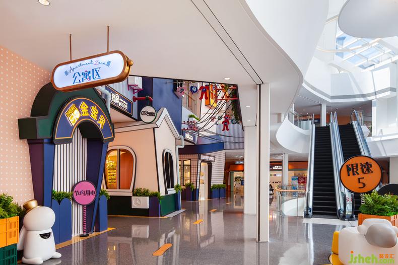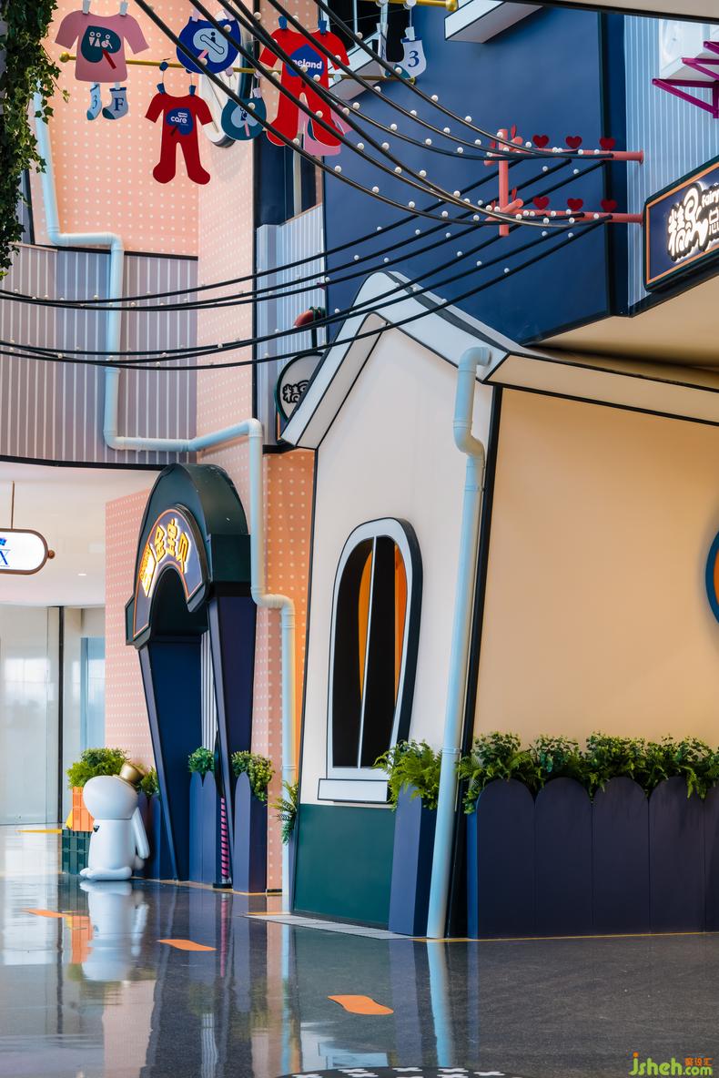 禮物盒主題區(qū)與公寓主題區(qū)摒棄了經(jīng)驗設計的手法。室內設計師放大版的禮物盒堆疊出了小城,被風暴吹得“東倒西歪”的房子打破次元,體現(xiàn)漫畫世界的童趣。在遵循空間邏輯與功能實現(xiàn)的前提下,設計師從日常生活場景出發(fā)為顧客制造了一場超現(xiàn)實的幻想式體驗。人行道彎彎折折地穿插在其間,室內設計師每個轉角都塞滿了奇趣巧思的興趣點設計,讓消費者的好奇心和探索欲被充分調動,延長人群在此逗留的時間