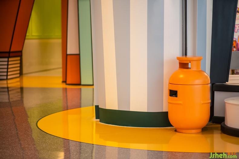 覆加軟包設計改造后的店間柱,室內設計師使店鋪與公區(qū)之間擺脫邊界感的束縛,削弱商業(yè)氛圍,更烘托了場景的沉浸式體驗。煤氣罐造型的垃圾桶,進一步還原了一個趣味十足的藝術生活街區(qū)。