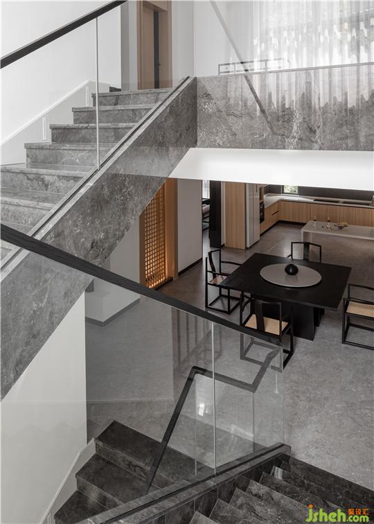 石材而成的轉角樓梯,透明玻璃隔板的扶手讓光線進入的同時,又巧妙地顯露了樓梯的特征、創(chuàng)造出非凡的燈效及空間深度。