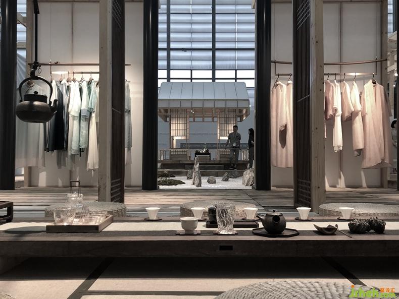 從石庭穿過透光屏風(fēng)后呈現(xiàn)的是更加純粹的東方文化情境,筆墨茶煙,青苔蒲草處處有情,面面生意,余味不盡??臻g軸線上對應(yīng)的長條屏風(fēng)既分割空間又留有余地,席地茶席的布置器物樸雅有妙韻,自成佳景。衡韻雅序陳列的錦繡羅衫于此情境中已然是無需任何渲染的一種靜態(tài)藝術(shù)。