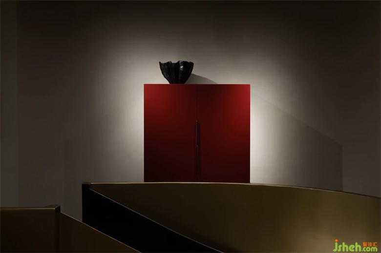 拆除掉局部的樓板過后,在空間置入一個圓形的旋轉(zhuǎn)樓梯在室內(nèi)連接樓上樓下兩個空間。家具展廳設(shè)計通過旋轉(zhuǎn)樓梯上到二樓空間,進(jìn)入到一個充滿靜謐、神秘的空間。產(chǎn)品凸顯了一股神秘的東方氣韻,正紅色的斗柜為空間增添了一筆濃厚的色彩。產(chǎn)品本身浸透在空間的專屬氣質(zhì),挖掘品牌本身的產(chǎn)品精神,塑造獨(dú)有的品牌屬性。展廳設(shè)計
