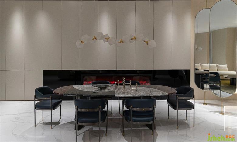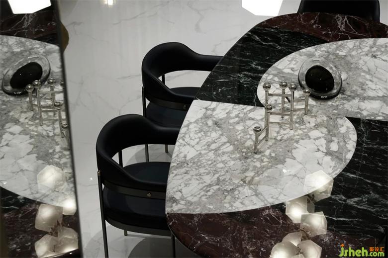 餐桌由整個寒江雪石材所打造,保留了其自然溫潤的質(zhì)感,