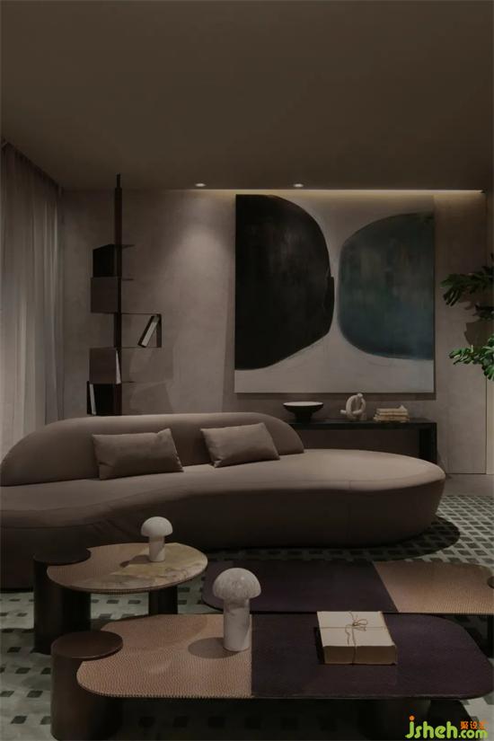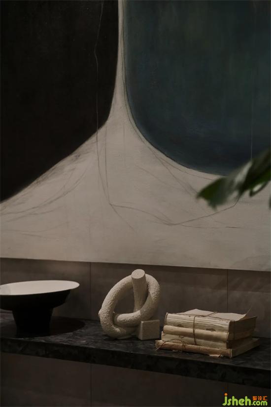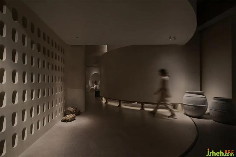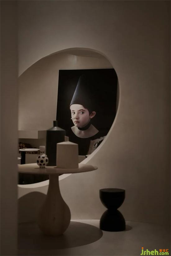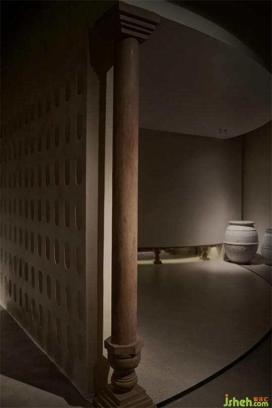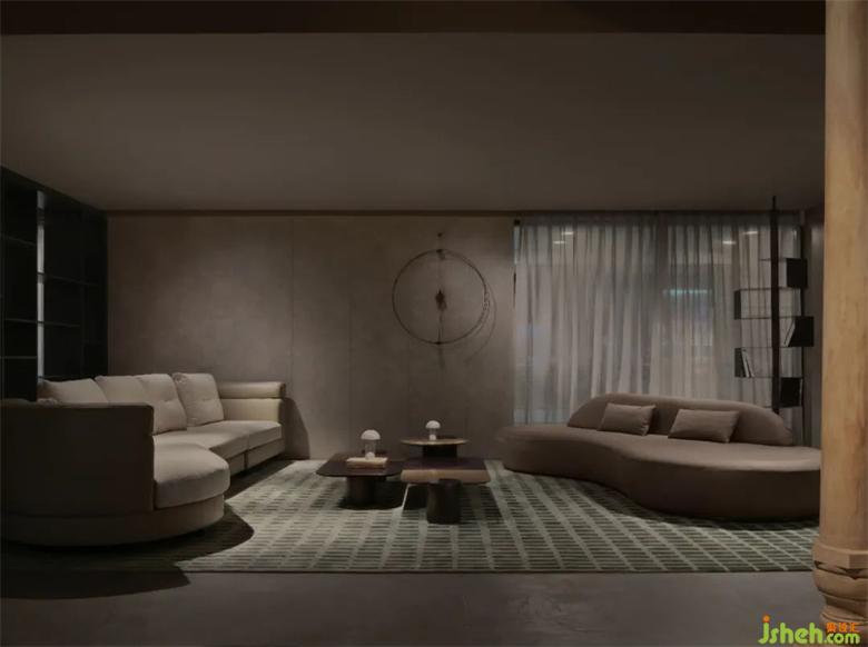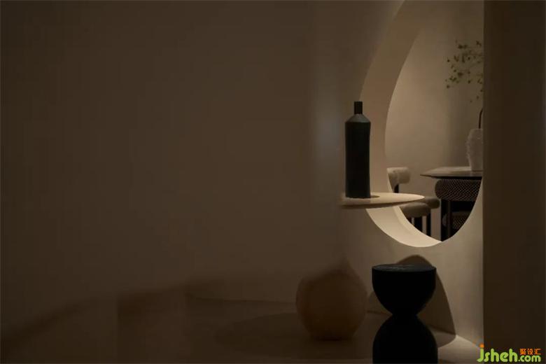 家居館設(shè)計(jì)區(qū)別于前廳的精致感與現(xiàn)代感,后場運(yùn)用了更加自由的設(shè)計(jì)手法,弧形通道將來客吸入到Art展區(qū)之中,屹立于整個(gè)空間中心的結(jié)構(gòu)柱本應(yīng)該是個(gè)麻煩,經(jīng)過弧形與切面的塑造卻成為了一個(gè)空間焦點(diǎn),像是藝術(shù)家創(chuàng)作的一件雕塑作品,家居館設(shè)計(jì)在自由的曲線之下,不同形態(tài)的羅馬柱散落其中,從入口處的立柱,到弧形墻面的腳墩,配合水紋玻璃在燈光下投射的陰影紋理,像是要娓娓道來一個(gè)童話一篇詩章。