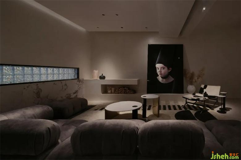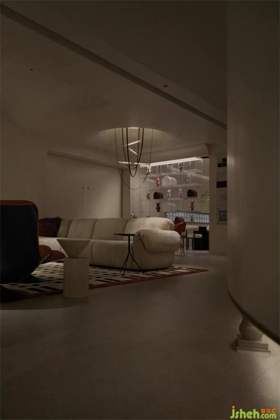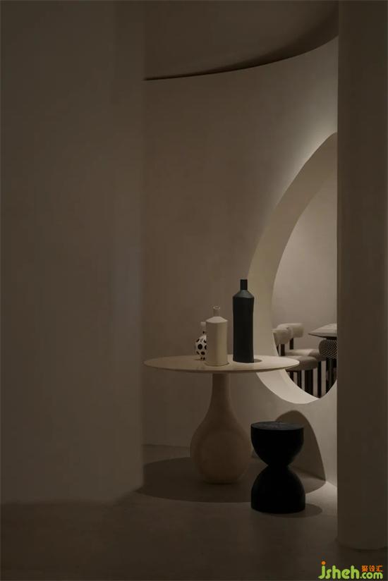 為了讓客人穿過前廳后能對(duì)后場(chǎng)區(qū)域繼續(xù)保持新鮮感,我們?cè)贚iving和Art展廳區(qū)域交界處創(chuàng)作了一個(gè)裝置性的藝術(shù)通道,人們會(huì)被這個(gè)內(nèi)建筑所吸引,具有吸引力的弧形墻體能讓展廳瞬間轉(zhuǎn)換空間情緒,神秘感油然而生,一步一步打開客人的好奇心,家居館設(shè)計(jì)后場(chǎng)濃郁的藝術(shù)氛圍會(huì)讓人心情愉悅,浪漫感油然而生。