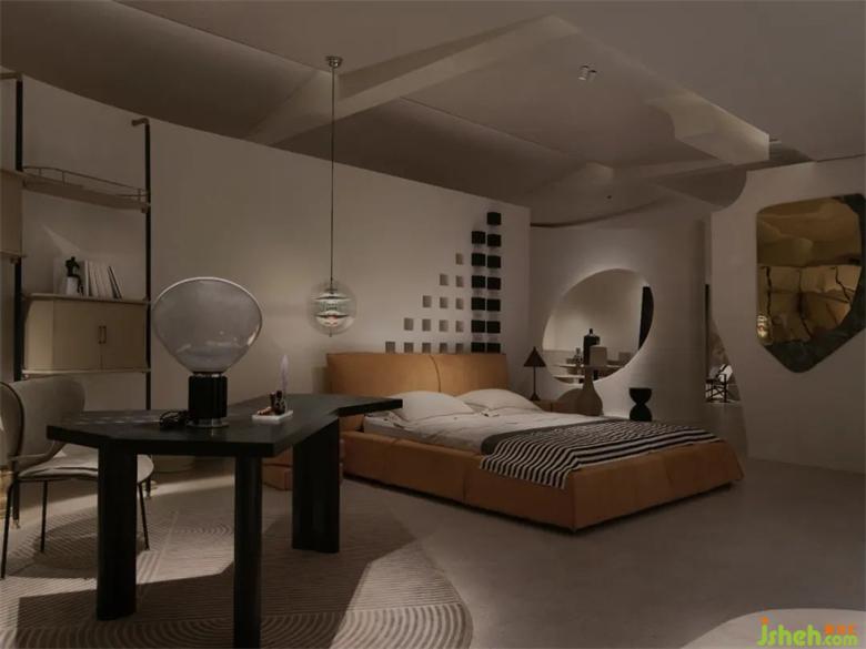 臥室空間靜謐而雅奢,磨砂質(zhì)感的床、黃古銅材質(zhì)的裝置掛鏡、家居館設(shè)計以及墻上帶有點(diǎn)中古味道的裝飾造型,給人的感覺這是一家很有文化素養(yǎng)以及內(nèi)涵的低調(diào)、質(zhì)樸、一些內(nèi)斂,圓鈍感更有包容性更加溫和更容易讓人接受。