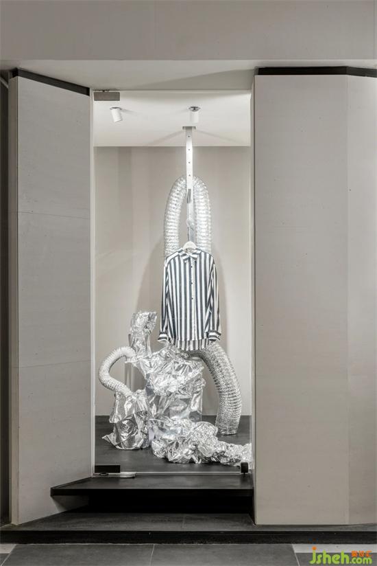 突破一貫的玻璃櫥窗展示面設(shè)定,將主入口隱藏在石材墻面交錯的空間中。旗艦店設(shè)計斜切石墻的一偶,作為展示櫥窗。利用簡單且有態(tài)度的藝術(shù)裝置,襯托出品牌所展示的女性瀟灑自如的狀態(tài)。