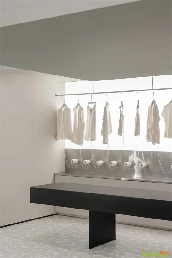 LEDIM WANG除了提供成衣以外,全系列產(chǎn)品也提供尺寸、顏色、面料的個性化定制服務(wù)。旗艦店設(shè)計因此設(shè)計團隊將前臺接待區(qū)與定制服務(wù)區(qū),兩個功能區(qū)整合,用框景的手法,結(jié)合背面的定制成衣展示空間,打造出有層次感的復(fù)合功能空間。