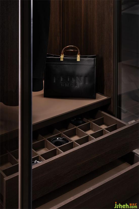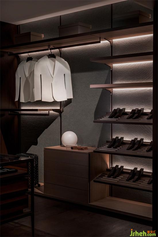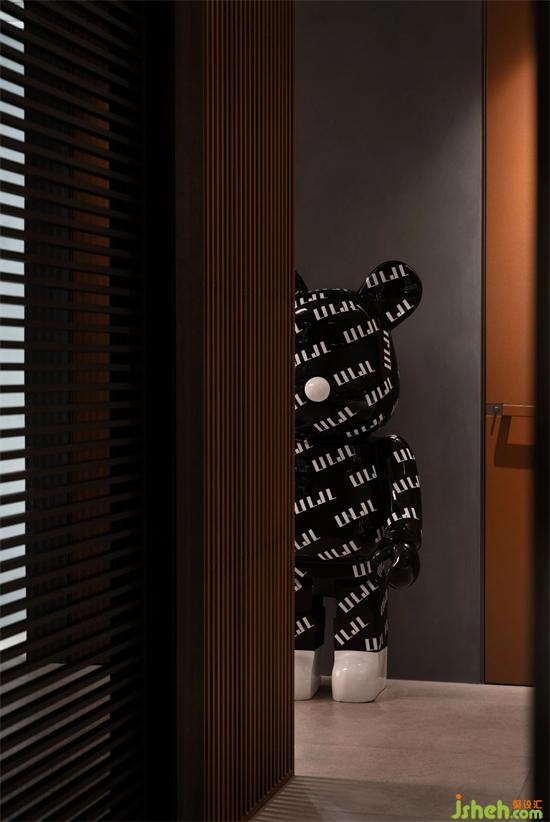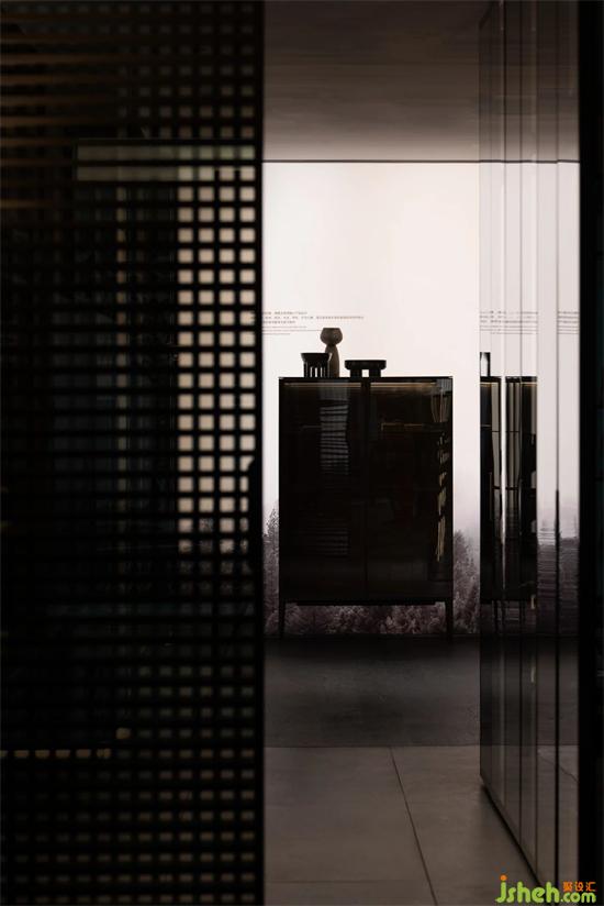走廊盡頭的端景,寫(xiě)著品牌的理念,潤(rùn)舍納圖以高柜加藝術(shù)品的形式呈現(xiàn),凝聚空間視線,化解走廊的單調(diào)。