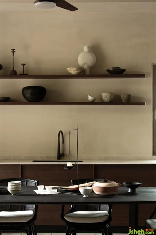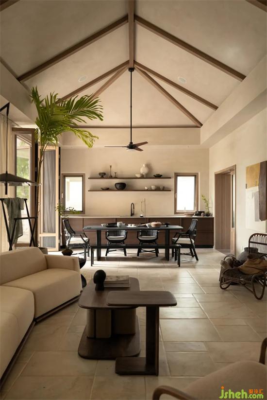 設(shè)計(jì)團(tuán)隊(duì)大刀闊斧,將全家的“動(dòng)”“樂”兩區(qū)設(shè)置在一層。推掉隔墻,去掉繁復(fù)的吊頂,將原本優(yōu)秀的層高顯露,形成通透而寬大的客廳空間,高且敞亮。別墅設(shè)計(jì)廚房在滿足常規(guī)居住8人的餐飲需求下一定得足夠?qū)挸ㄇ覍?shí)用。將入戶的廚房移動(dòng)至右側(cè)靠近院落,開窗通風(fēng),家人歸家路過之時(shí),廚房正熱鬧,菜香飄至院里,歸家之感濃烈。
