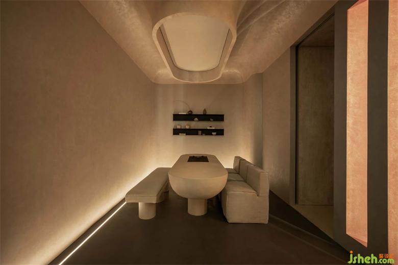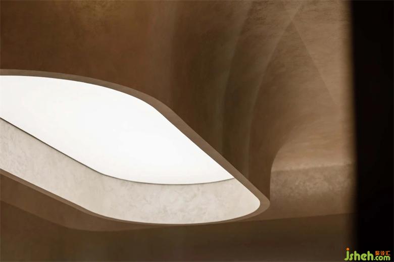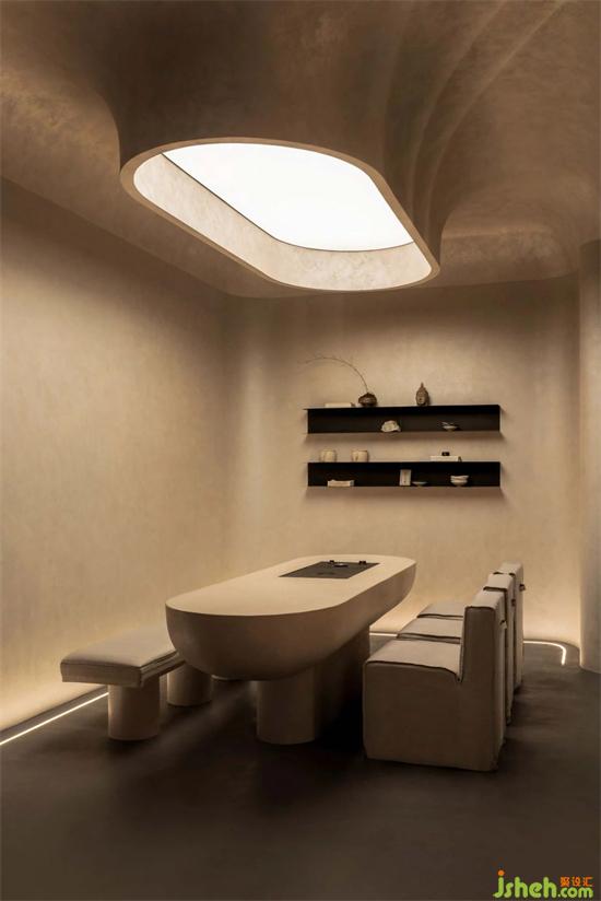 在環(huán)形走廊的的盡頭恰好有兩處新的入口,像是被人發(fā)掘過一般,垂吊至下的弧形頂棚開鑿出天光,剛好投射在石桌上,而反射至頂面的光線讓整個空間充滿波光粼粼的金屬質(zhì)感,展廳設(shè)計(jì)發(fā)掘此處的前人可能就在這里飲茶聊天吧。