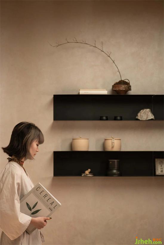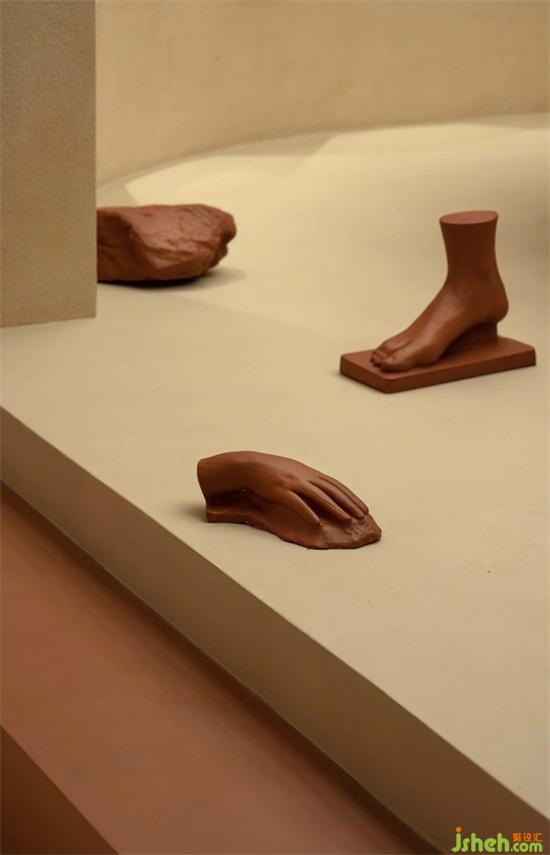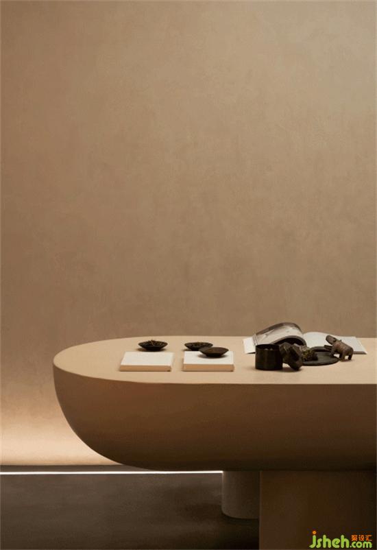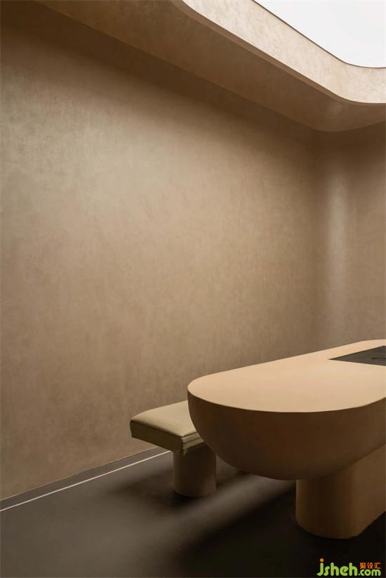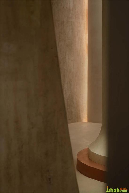 茶室前是尤勒貝特Europaint藝術(shù)涂料搭建的產(chǎn)品研發(fā)陳列區(qū),利用活石經(jīng)過高溫煅燒、分解、過濾等二十幾道工序制作而成的石灰,再進(jìn)行調(diào)和做成灰泥并與色漿碰撞,展廳設(shè)計(jì)通過精細(xì)的手法創(chuàng)作出種類繁多的藝術(shù)肌理效果,實(shí)驗(yàn)的痕跡充斥著整個空間,續(xù)寫著這里的故事。