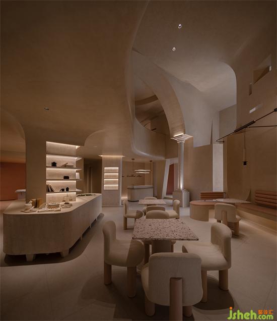 會(huì)所設(shè)計(jì)利用那些保留著古老悠長(zhǎng)之夢(mèng)的空間結(jié)構(gòu)引起人們的共鳴,從新古典主義借鑒過(guò)來(lái)的熟悉感,構(gòu)建并召喚集體回憶,在被抽象的歷史印象所充斥的環(huán)境中,當(dāng)代生活的轉(zhuǎn)瞬即逝被消解,會(huì)所設(shè)計(jì)與羅馬柱呼應(yīng)的是更有巖石形態(tài)與質(zhì)感的幾何體塊,直立的、傾斜的,穿插在空間中與弧面相接,內(nèi)嵌的"石龕"中陳放著手工敲打的鐵盒香薰與書(shū)卷,述說(shuō)著一段秘史。