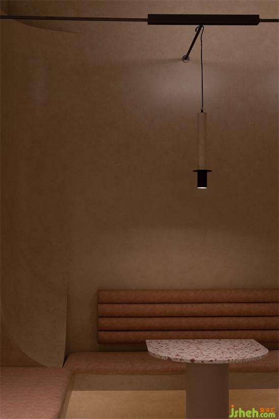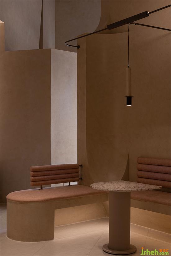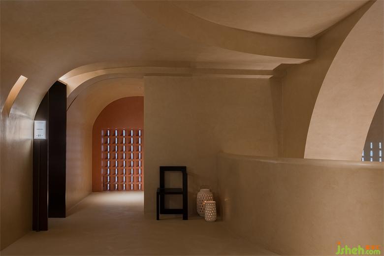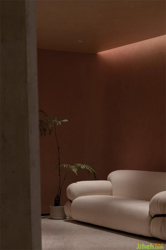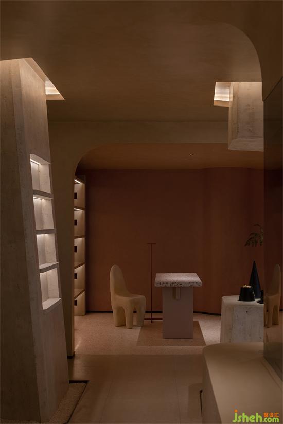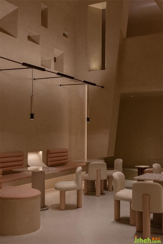 大面積沙色與淺紅砂巖色包裹整個內(nèi)建筑空間,向到訪的客人們最大限度展示“接納”的誠意。會所設計珊瑚色的坐墊,散落著粉水晶般的水磨石桌面,的好像暗藏在女性靈魂中,不會隨時間消逝的浪漫與溫柔。我們在墻壁上鑿出洞窟,將天光捕捉進室內(nèi)。也以建筑材料疊加的方式,模擬出天光乍泄的自然感官。
