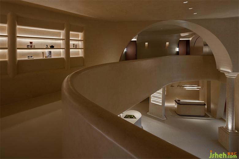 順著觸感細膩又柔軟的地毯,向上行走,去掠過外墻鏤空投進來的日光;會所設計轉交之間,去揉化掉充滿他人想象的妝容,從生活道具的角色扮演中抽離,一個個如在洞穴中鑿出的獨立美容操作空間里,即將上演關乎“美”的短劇。