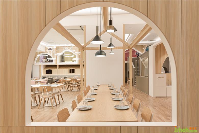 蔬菜與水果是餐廳的vi形象主體。一棵巨大的西蘭花在入口處以歡迎的姿態(tài)迎接到訪的客人,原本是大多數(shù)小朋友最“畏懼”的蔬菜,一下子活潑可愛起來。穿過白色的的鞋柜與展示架組成的玄關(guān),跨過拱形的門洞就算是正式進入到這個“兒童與父母的樂園了”。