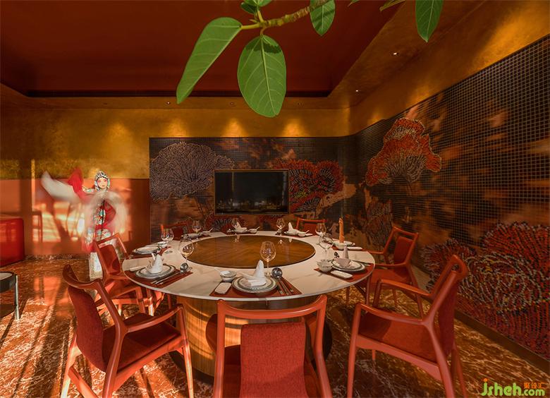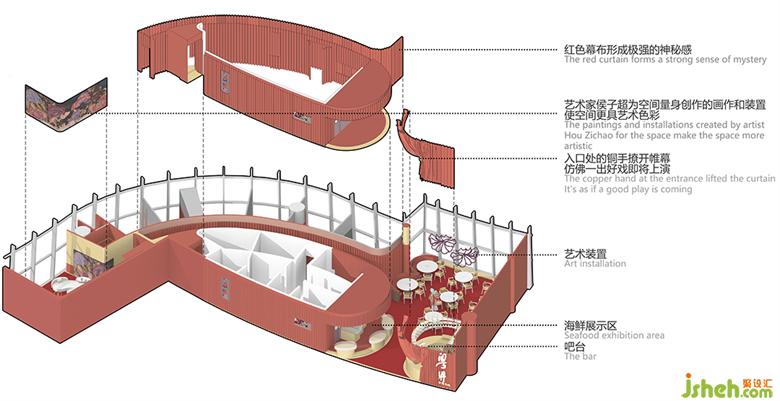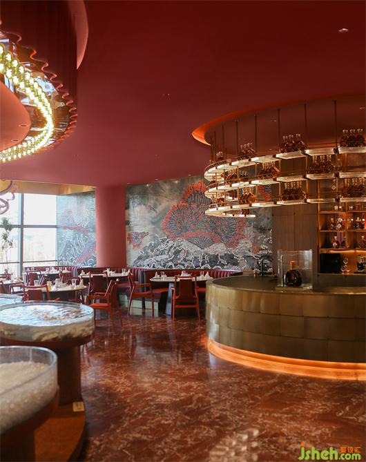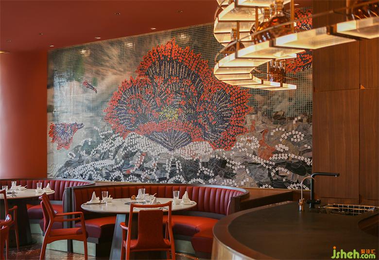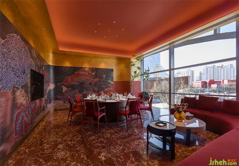 餐飲設(shè)計(jì)根據(jù)空間現(xiàn)有的紅金基調(diào),加入灰白色調(diào)令空間增加明快輕盈感,并突出主體物的鮮明配色。