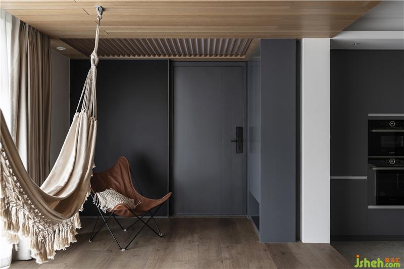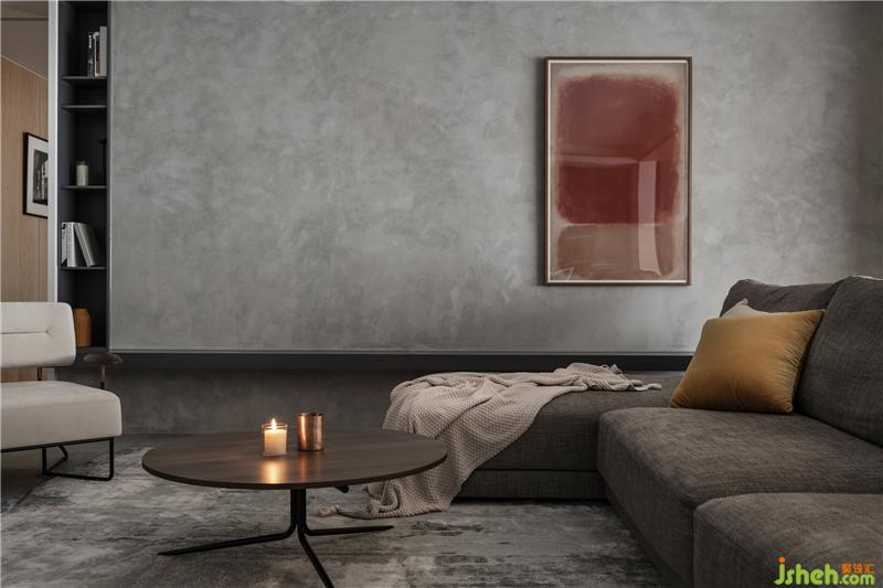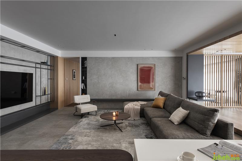 兩側(cè)水泥藝術(shù)漆圍合出客廳空間感,沙發(fā)后“L”型懸挑板,制造出空間小趣味,木制格柵門是通往書房的入口。