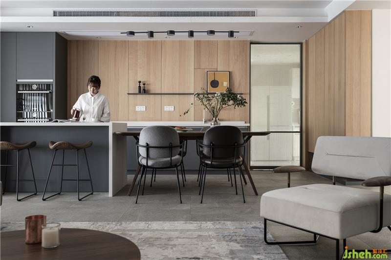 烘焙區(qū)與餐桌相連,烘焙的同時(shí)滿足友人小聚,靜謐的灰色與原木色搭配,體現(xiàn)高級(jí)感的同時(shí)融入溫暖居家氣息。