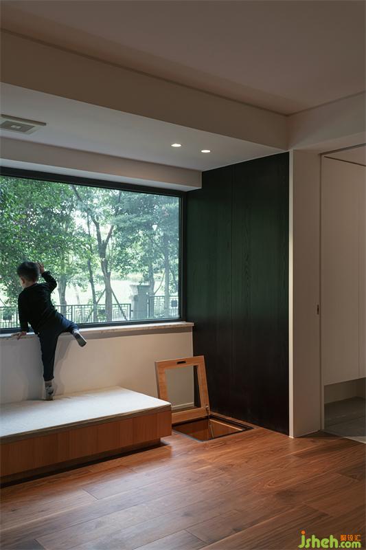 三代人的生活起居有所不同,因人而異構(gòu)筑獨立又共融的空間,讓個體得以安心放逐自我,同時擁有親密互動的公區(qū)場域:茶室作為實現(xiàn)女主人茶藝和花藝的生活美學(xué)場所,又與孩子的兒童游戲間上下相連;男主人鐘愛地下安靜的科研辦公室,推門路過健身吧臺區(qū)又是一家人的其樂融融的影音室;阿婆可以在臥房生活陽臺織一下午毛衣,也可推門在客廳照看兒孫,家人間互動空間模糊又清晰,獨立又親密。