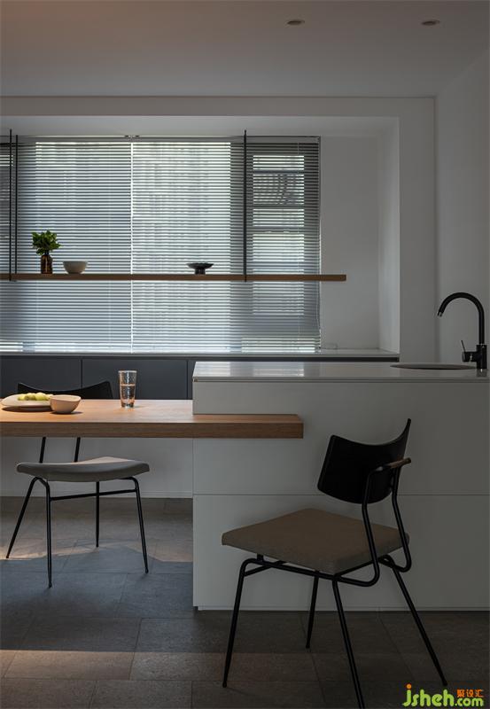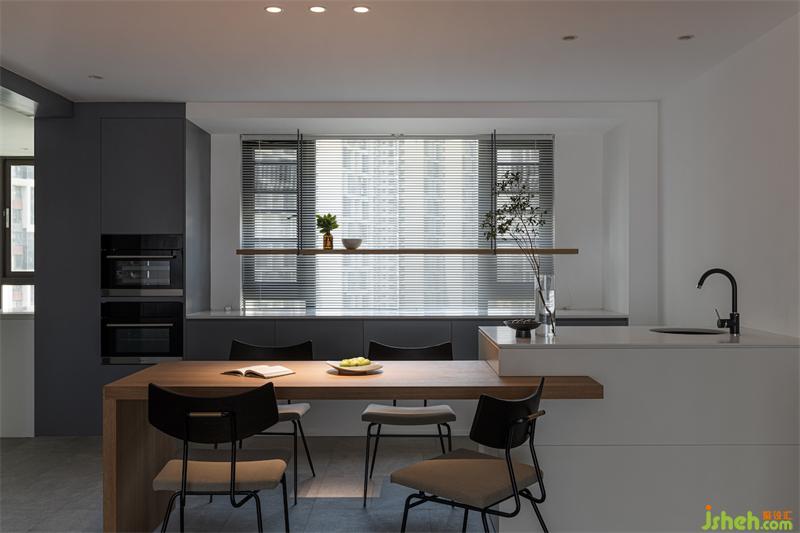 輕食區(qū)是定制的組合式島臺,成都黑白灰設(shè)計采用白色與原木色搭配,在開放又包容的空間,讓居住者之間擁有更好的互動體驗。