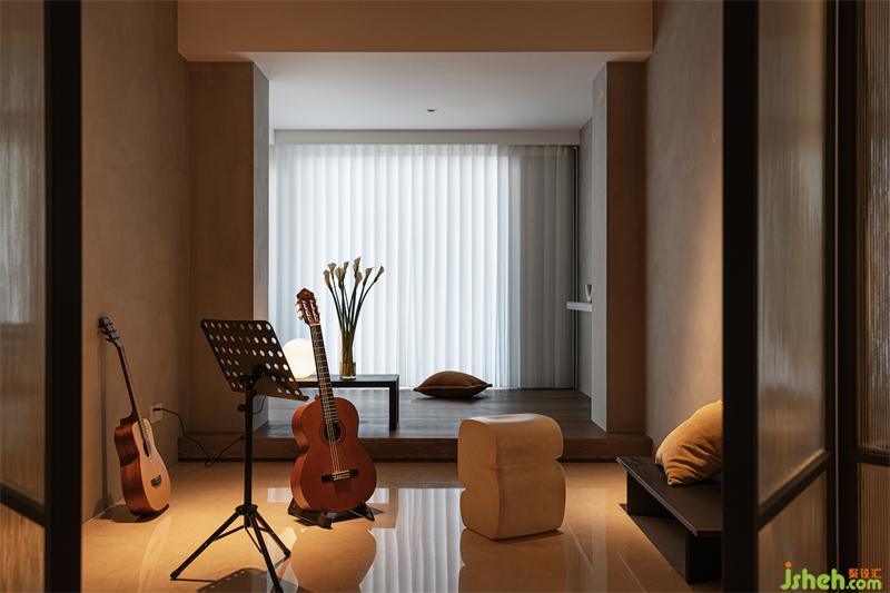 從空間來看,為了給予屋主更安定的居家感受,每處功能區(qū)都以半圍合的形態(tài)呈現(xiàn),既不是完全敞開也不是完全封閉,讓空間相對獨(dú)立又和諧統(tǒng)一。璞珥空間設(shè)計(jì)充滿文藝氣息的樂器房在不同的使用狀態(tài)下可靜可動,有私密性卻又不封閉沉悶。