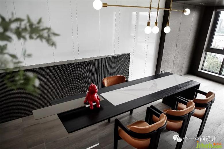 我們通過以“土”元素為基礎的巖板、“金”元素的銅件、“木”元素的橡木以及“水”元素的亞克力為創(chuàng)意源,裝修設計了互動空間中的家居產(chǎn)品——合桌,為這個空間增添了一份個性與唯一,一沏一注間人與人有了對話,主與賓之界有了模乎。張占占老師的藝術單品俏皮的敘說著這個空間的安靜,不多不少,一切剛剛好。