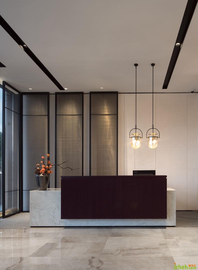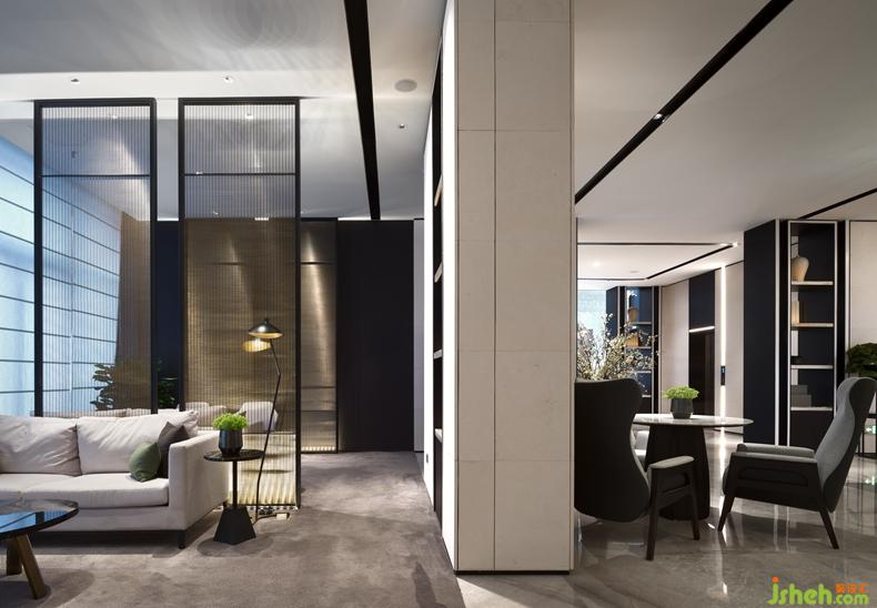 接待區(qū)在柱子中嵌入了架子,空間的流動(dòng)性更加明顯,感官不再限制于方方正正的局部,可以透過(guò)架子感受空間層次起伏。