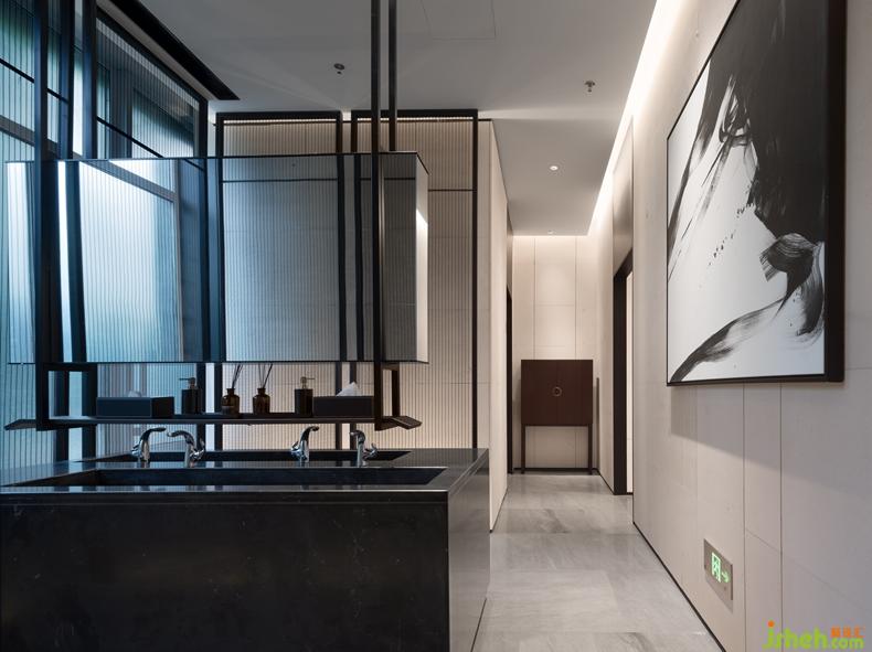 設(shè)計(jì)主材:淺灰色大理石、魚肚白大理石、硯石、淺色溫潤(rùn)面大理石、深色木飾面、木地板、深色鋼絲網(wǎng)、黑色拉絲不銹鋼