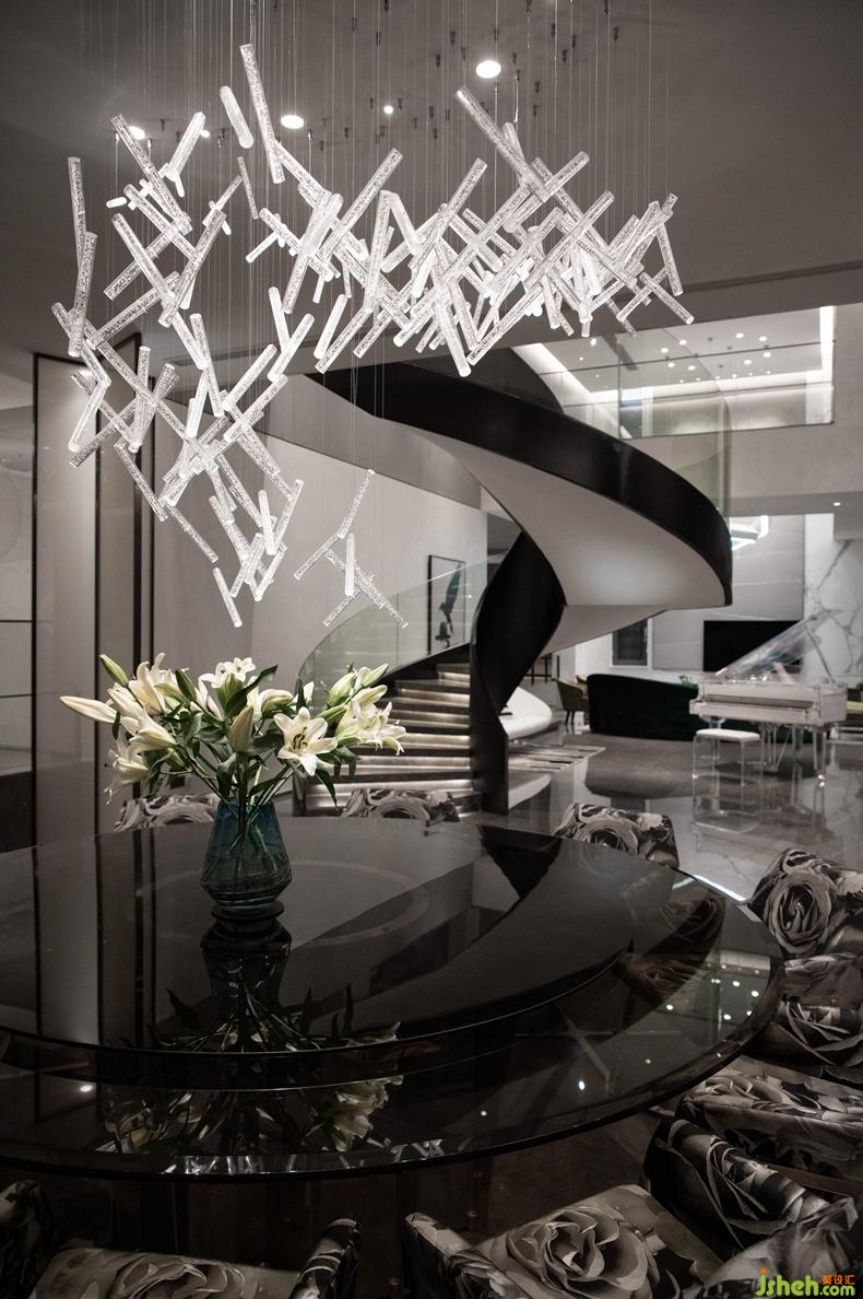 客廳里的圓形樓梯猶如雕塑般的存在,是設(shè)計(jì)中的神來之筆。這個(gè)樓梯與其說是功能需要,倒不如說是精神需要。因?yàn)閺墓δ苌蟻碚f,從三層至二層可以有一個(gè)樓梯和電梯來通達(dá),實(shí)際上,這個(gè)圓形樓梯是專門為女主人設(shè)置的,它夠大夠氣派形態(tài)優(yōu)雅,成為客廳空間的核心,統(tǒng)領(lǐng)空間結(jié)構(gòu),有了它,客廳空間就有了一種力量與氣場(chǎng),有了靈魂。它,是對(duì)主人生命的贊美。我們希望,每一天早晨,女主人從這個(gè)圓形樓梯緩緩拾級(jí)而下,環(huán)顧高敞的客廳,有一種“女王”般的驕傲、優(yōu)雅、豪邁,胸懷壯闊,大愛無疆。