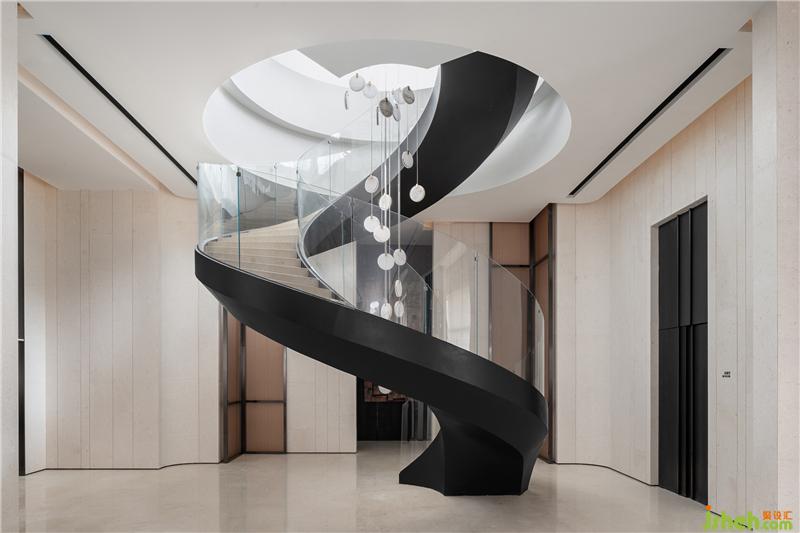 在層層遞進(jìn)的過程中,空間的力量從未削減,中軸盡端的旋轉(zhuǎn)樓梯如同雕塑般極具張力,輕盈而富有力量。自然光與藝術(shù)裝置的灑落,引領(lǐng)人們到達(dá)屋頂花園,收獲另一番景象。 室內(nèi)設(shè)計(jì)師
