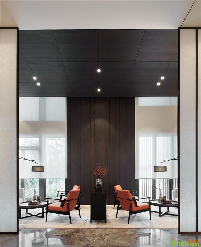 沉郁素樸的深色界面圍合了一個半私密的體驗(yàn)空間,儒雅的米白色沙發(fā),穿插灰藍(lán)色和橙色來調(diào)節(jié)室內(nèi)氛圍,豐富內(nèi)部層次。