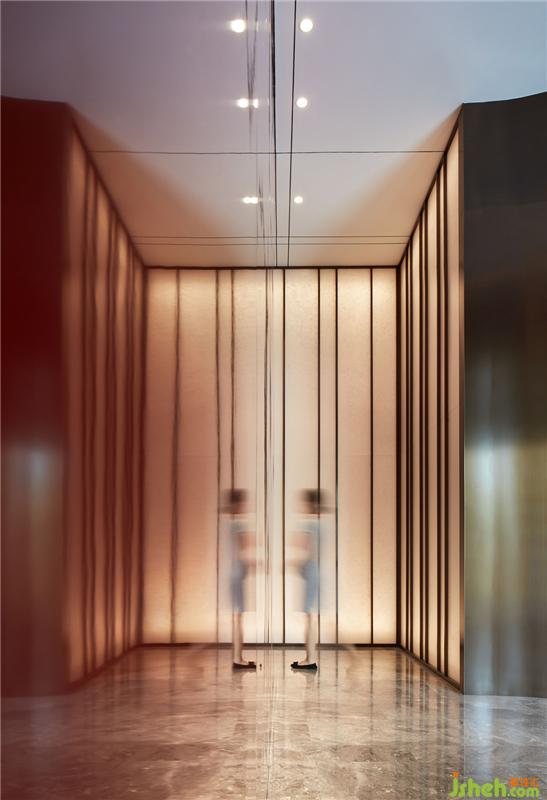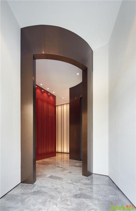 通往室外的過廳,用拉絲古銅塑造了一個簡潔的半弧形框架,內(nèi)部同樣通過透光材料搭配情景光源,影響其透光率的變化,產(chǎn)生遠(yuǎn)近不同層次的光影效果。