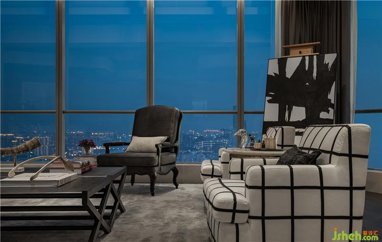 公共空間的家具選型與陳列方式以會(huì)客廳的形式展現(xiàn),圍合的沙發(fā)與單椅構(gòu)成具有場(chǎng)景感的交流空間。建筑立面玻璃幕墻,270°城市景觀,在城市地標(biāo)中心,享有天際線的廣闊景致,獨(dú)屬的城市景觀。