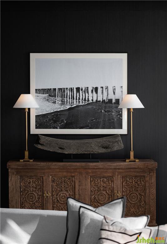 例如客廳的老木裝飾柜、朽木雕,搭配藝術(shù)攝影作品,為空間增強(qiáng)了耐人尋味的細(xì)節(jié)。