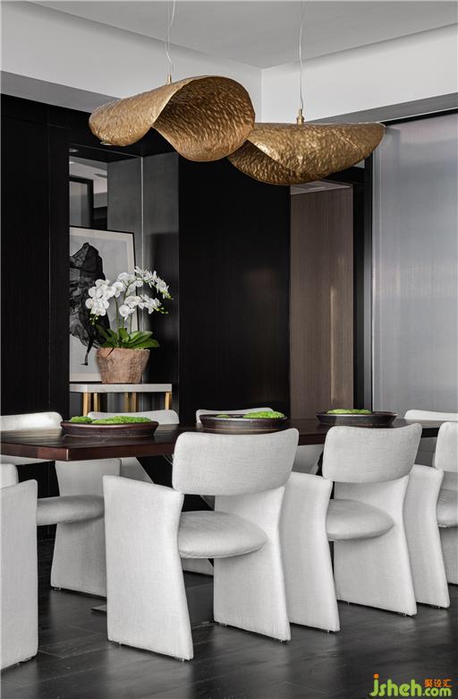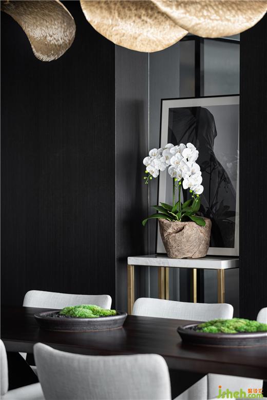 餐廳的兩側(cè)墻面,設(shè)計(jì)了對(duì)稱的玻璃挑空隔斷,置上一桌一畫,點(diǎn)綴一盆清朗的蘭花,又增添了一處動(dòng)人的空間。