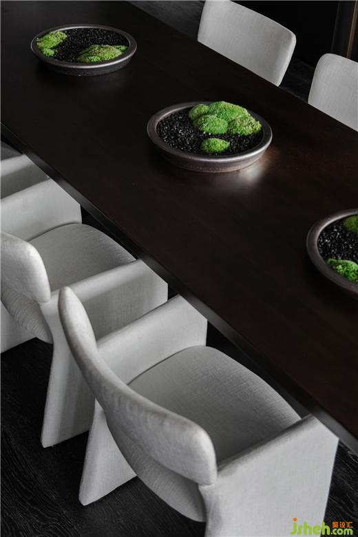 桌面上的苔蘚盆景,沒(méi)有高的姿態(tài)沒(méi)有濃的色彩,樣板房設(shè)計(jì)只是單純地跟原木搭配在一起,別有一番自然氣息。